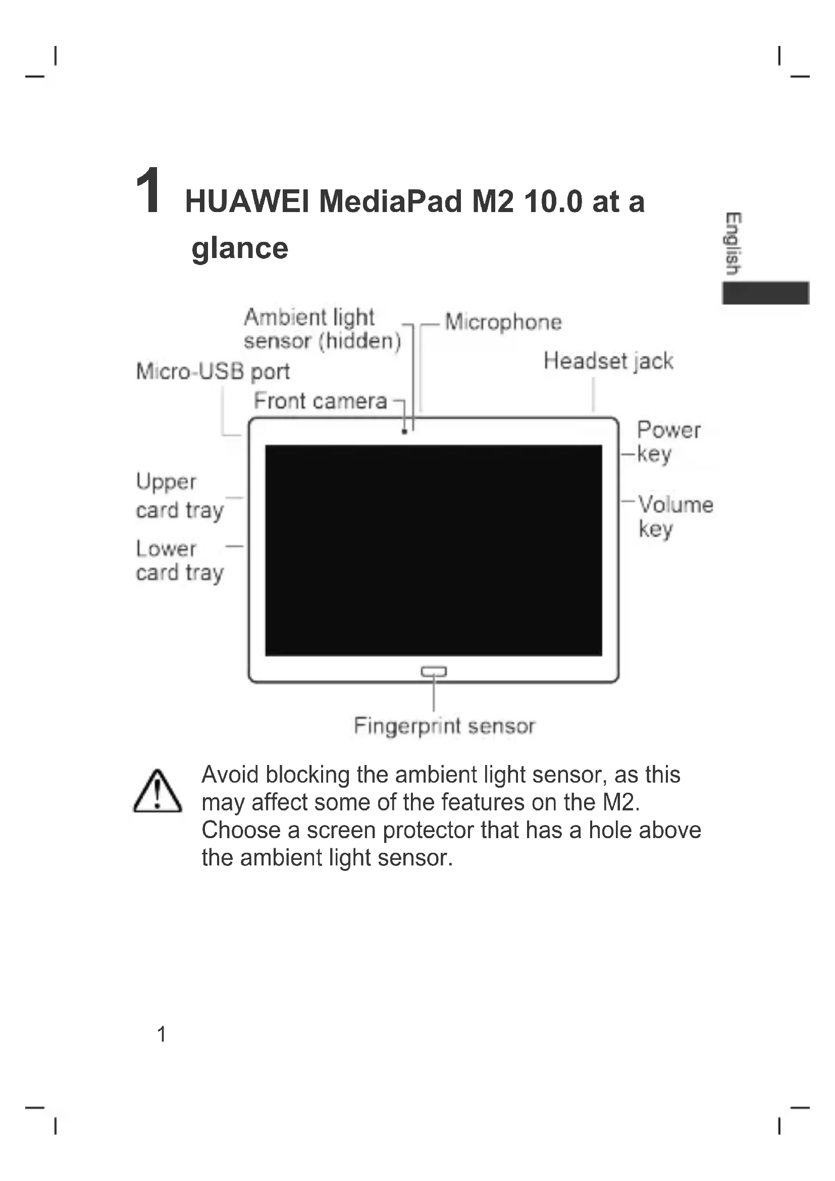 1 HUAWEI MediaPad M2 10.0 at a glance Avoid blocking the ambient light sensor, as this may affect some of the features on the M2. Choose a screen protector that has a hole above the ambient light sensor.2 2 Card insertion