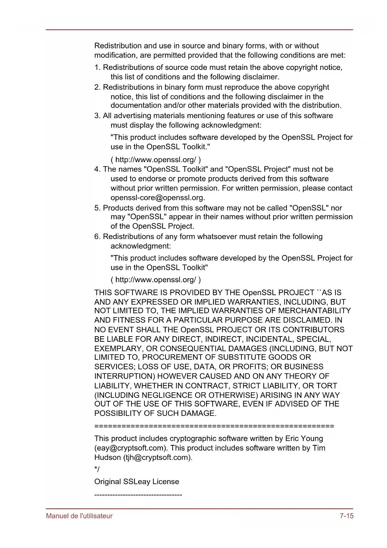 Manuel de l'utilisateur 7-15/* Copyright (C) 1995-1998 Eric Young (eay@cryptsoft.com) All rights reserved. This package is an SSL implementation written by Eric Young (eay@cryptsoft.com). The implementation was written so as to conform with Netscapes SSL. This library is free for commercial and non-commercial use as long as the following conditions are aheared to. The following conditions apply to all code found in this distribution, be it the RC4, RSA, lhash, DES, etc., code; not just the SSL code. The SSL documentation included with this distribution is covered by the same copyright terms except that the holder is Tim Hudson (tjh@cryptsoft.com). Copyright remains Eric Youngs, and as such any Copyright notices in the code are not to be removed. If this package is used in a product, Eric Young should be given attribution as the author of the parts of the library used. This can be in the form of a textual message at program startup or in documentation (online or textual) provided with the package. Redistribution and use in source and binary forms, with or without modification, are permitted provided that the following conditions are met: