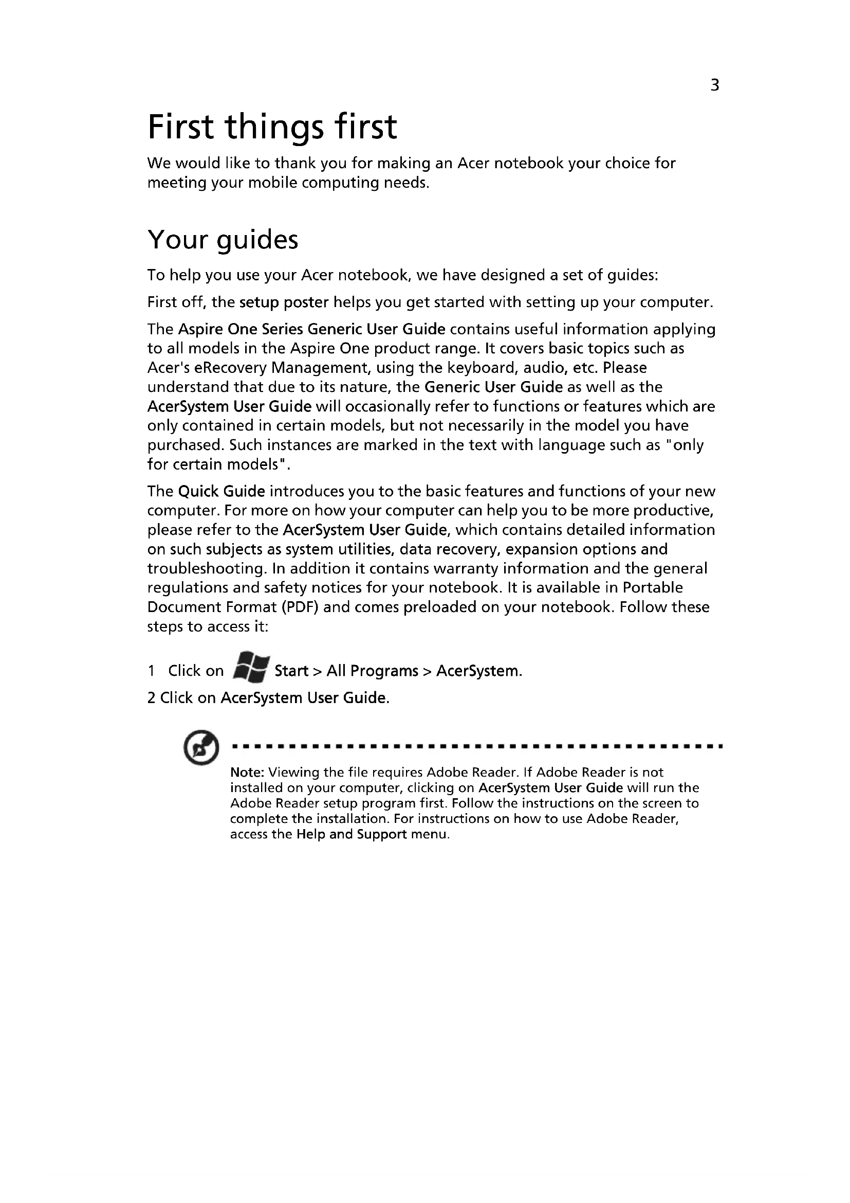 Bahasa Indonesia ä·Â ContentsAspire One Series Quick GuideModel number: __________________________________ Serial number: ___________________________________ Date of purchase: ________________________________ Place of purchase: ________________________________ © 2010 All Rights Reserved. Aspire One Series Quick Guide Original Issue: 11/2010 Aspire One Series Notebook PC3 First things first We would like to thank you for making an Acer notebook your choice for meeting your mobile computing needs. Your guides To help you use your Acer notebook, we have designed a set of guides: First off, the setup poster helps you get started with setting up your computer. The Aspire One Series Generic User Guide contains useful information applying to all models in the Aspire One product range. It covers basic topics such as Acer's eRecovery Management, using the keyboard, audio, etc. Please understand that due to its nature, the Generic User Guide as well as the AcerSystem User Guide will occasionally refer to functions or features which are only contained in certain models, but not necessarily in the model you have purchased. Such instances are marked in the text with language such as "only for certain models". The Quick Guide introduces you to the basic features and functions of your new computer. For more on how your computer can help you to be more productive, please refer to the AcerSystem User Guide, which contains detailed information on such subjects as system utilities, data recovery, expansion options and troubleshooting. In addition it contains warranty information and the general regulations and safety notices for your notebook. It is available in Portable Document Format (PDF) and comes preloaded on your notebook. Follow these steps to access it: 1 Click on Start > All Programs > AcerSystem. 2 Click on AcerSystem User Guide. Note: Viewing the file requires Adobe Reader. If Adobe Reader is not installed on your computer, clicking on AcerSystem User Guide will run the Adobe Reader setup program first. Follow the instructions on the screen to complete the installation. For instructions on how to use Adobe Reader, access the Help and Support menu.4 English Your Acer notebook tour After setting up your computer as illustrated in the setup poster, let us show you around your new Acer notebook. Top view # Icon Item Description1 Microphone Internal microphone for sound recording.2 Display screen Also called Liquid-Crystal Display (LCD), displays computer output (configuration may vary by model).3 Power button Turns the computer on and off.