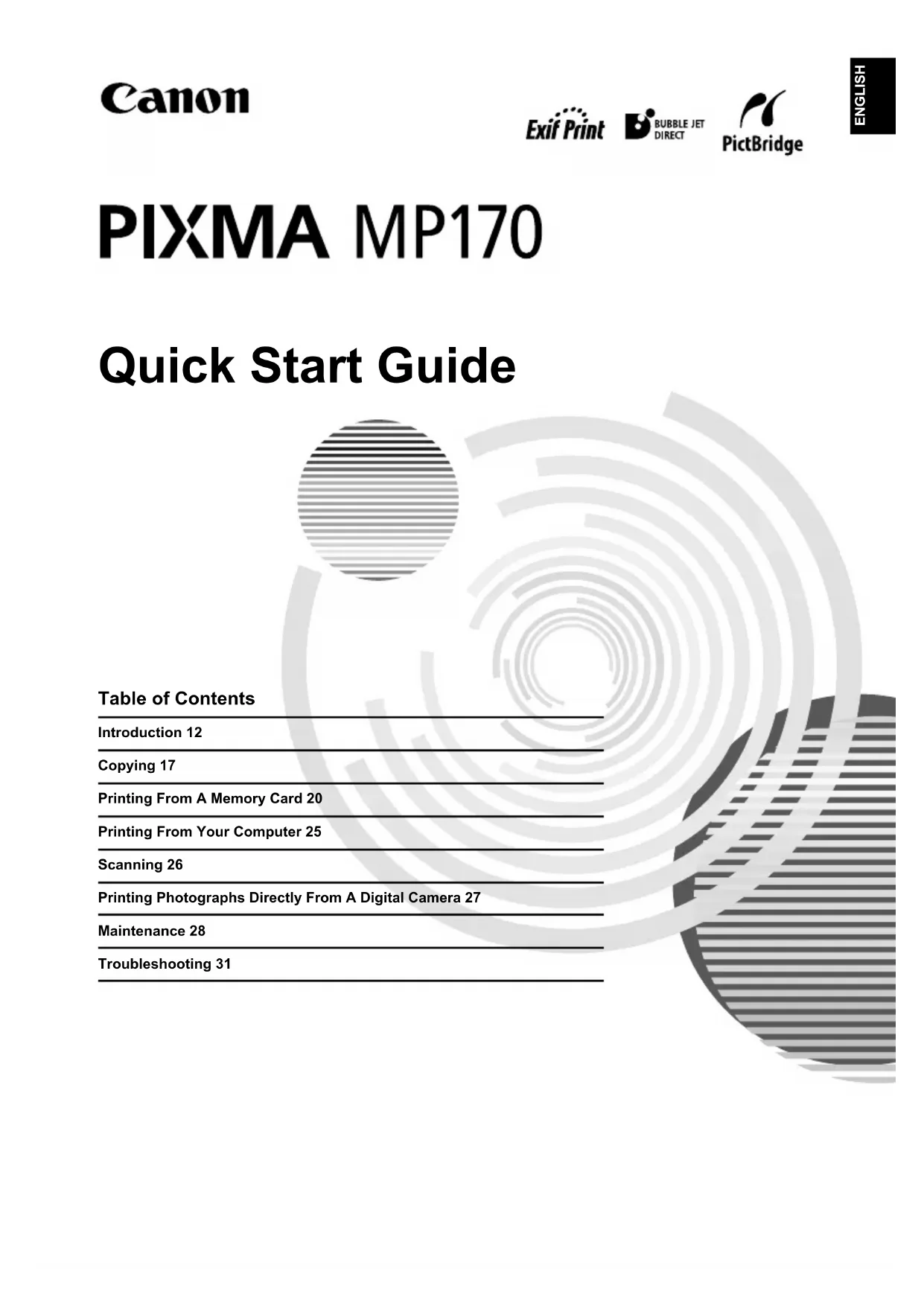 using Mac OS X v.10.2.x) icon. If the printer is displayed in the [Printer List], the printer driver is installed. If the printer is not displayed in the [Printer List], click [Add] in the [Printer List] and select [USB] from the pop-up menu. Select [MP170] from the [Product] list and click [Add]. When connecting from Mac OS X v.10.3.3 or earlier: Restarting the computer while connected to the machine may cause the machine not to be detected. To resolve this, either unplug the USB cable then plug it back in again, or turn the machine OFF then back ON again. Lis2QSG_GB.book Page 3 Thursday, July 14, 2005 3:01 PM4 ENGLISH Disclaimer Canon Inc. has reviewed this manual thoroughly in order that it will be an easy-to-use guide to your Canon MP170 Series. All statements, technical information and recommendations in this manual and in any guides or related documents are believed reliable, but the accuracy and completeness thereof are not guaranteed or warranted, and they are not intended to be, nor should they be understood to be, representation or warranties concerning the products described. Specifications are subject to change without notice. As an ENERGY STAR® partner, Canon Inc. has determined that this product meets the ENERGY STAR® guidelines for energy efficiency. This machine supports Exif 2.21 (also called “Exif Print”). Exif Print is a standard for enhancing the communication between digital cameras and printers. By connecting to an Exif Print-compliant digital camera, the camera’s image data at the time of shooting is used and optimized, yielding extremely high quality prints. Trademark Notices