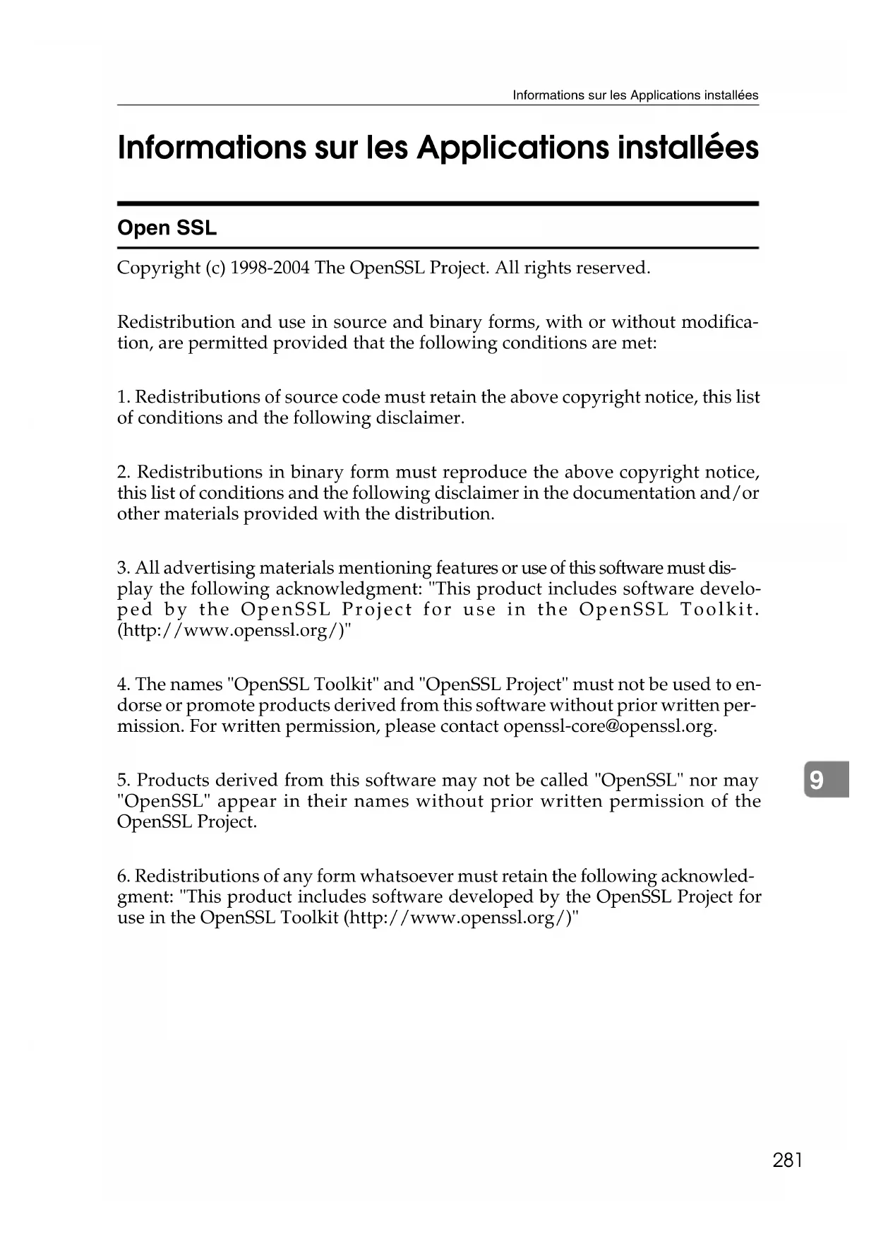 Informations sur les Applications installées Open SSL Copyright (c) 1998-2004 The OpenSSL Project. All rights reserved. Redistribution and use in source and binary forms, with or without modifica- tion, are permitted provided that the following conditions are met: