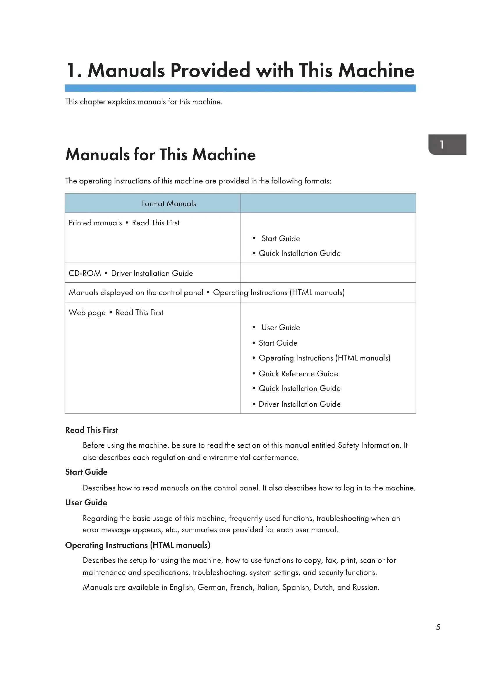 - Driver Installation Guide Read This First Before using the machine, be sure to read the section of this manual entitled Safety Information. It also describes each regulation and environmental conformance. Start Guide Describes how to read manuals on the control panel. It also describes how to log in to the machine. User Guide Regarding the basic usage of this machine, frequently used functions, troubleshooting when an error message appears, etc., summaries are provided for each user manual. Operating Instructions (HTML manuals) Describes the setup for using the machine, how to use functions to copy, fax, print, scan or for maintenance and specifications, troubleshooting, system settings, and security functions. Manuals are available in English, German, French, Italian, Spanish, Dutch, and Russian. 5User Guide and Security Guide are available in the seven languages above and other languages. For details about how to use the HTML manuals, see page 7 "How to Use the Operating Instructions". Quick Reference Guide Describes per page the basic functions of copy, fax, and scan.