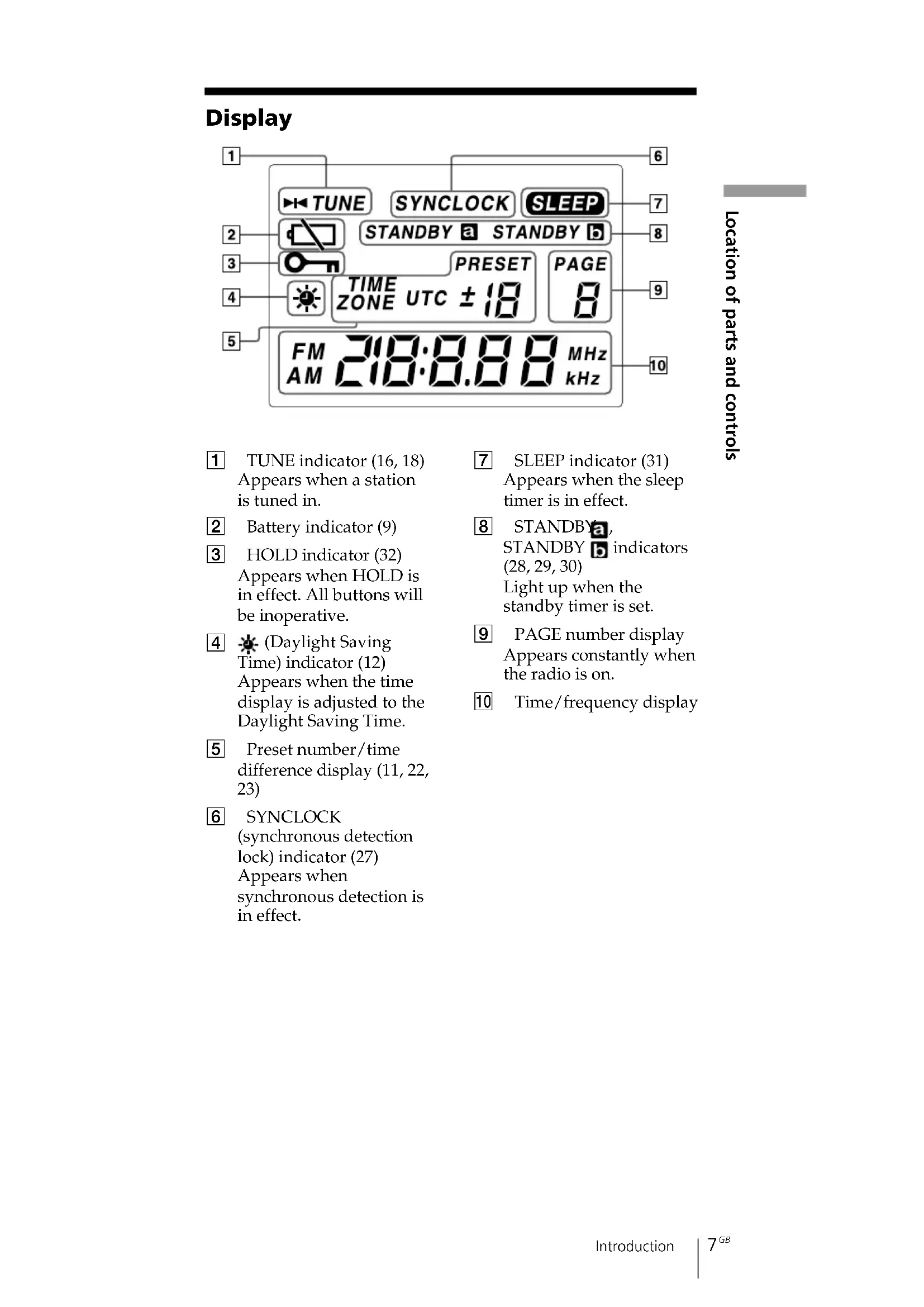 ocation of parts and controls Display 1 TUNE indicator (16, 18) Appears when a station is tuned in. 2 Battery indicator (9) 3 HOLD indicator (32) Appears when HOLD is in effect. All buttons will be inoperative.