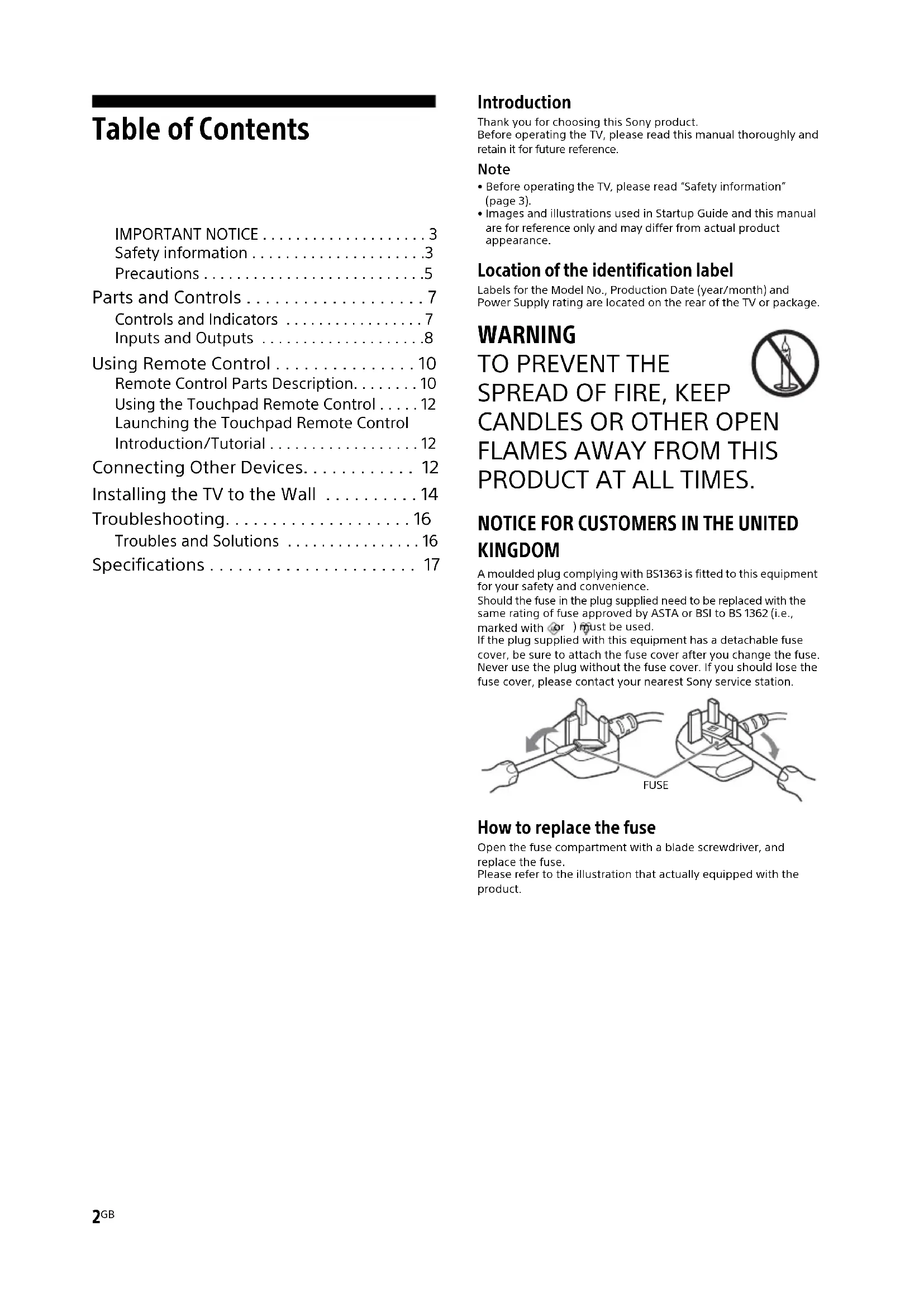 D:\_SONY TV\Final (not yet Bill)\SY150100_4K XC_XCLL EU RG (Rev- 2)\4574955131\01GB\010COVTOC_GB.fm masterpage: Left KD-65S8505C / 65S8005C / 55S8505C / 55S8005C 4-574-955-13(1) Mains lead Handle the mains lead and socket as follows in order to avoid any risk of fire, electrical shock or damage and/or injuries: Insert the plug fully into the mains socket. Operate the TV set on a 220 V - 240 V AC supply only. When wiring cables, be sure to unplug the mains lead for your safety and take care not to catch your feet on the cables. Disconnect the mains lead from the mains socket before working on or moving the TV set. Keep the mains lead away from heat sources. Unplug the mains plug and clean it regularly. If the plug is covered with dust and it picks up moisture, its insulation may deteriorate, which could result in a fire. Note