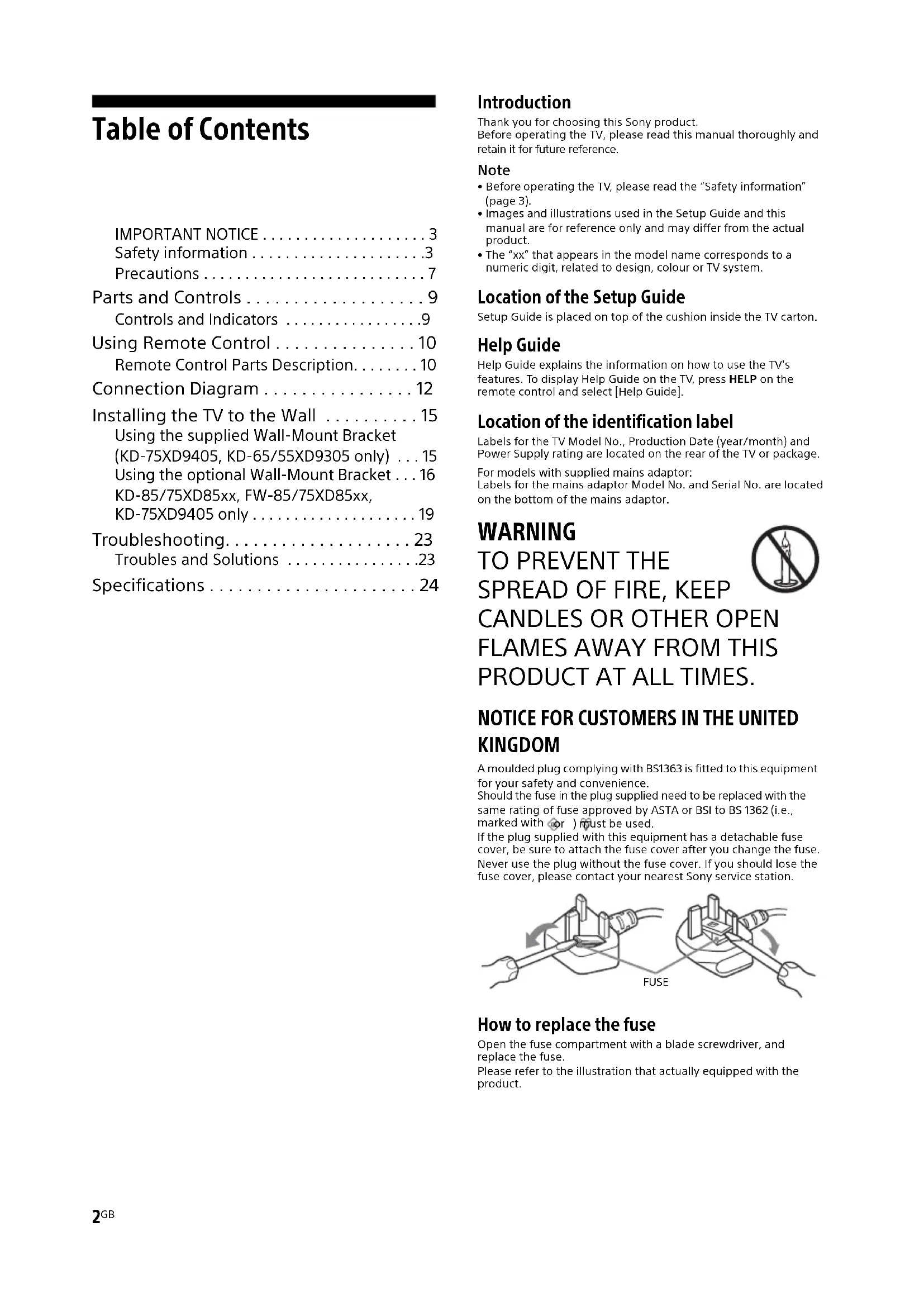 D:\_SONY TV\SY150217_QH 85 EU RG\4584644151\01_4584644151_GB\010COVTOC_GB.fm masterpage: Left KD-85XD85xx / 75XD9405 / 75XD85xx / 65XD9305 / 65XD85xx / 55XD9305 / 55XD85xx / FW-85XD85xx / 75XD85xx / 65XD85xx / 55XD85xx 4-584-644-15(1) NOTE ON MAINS ADAPTOR (models with supplied mains adaptor only) Warning To reduce the risk of fire or electric shock, do not expose this apparatus to rain or moisture. To prevent fire or shock hazard, do not place objects filled with liquids, such as vases, on the apparatus. Do not install this equipment in a confined space, such as a bookshelf or similar unit.