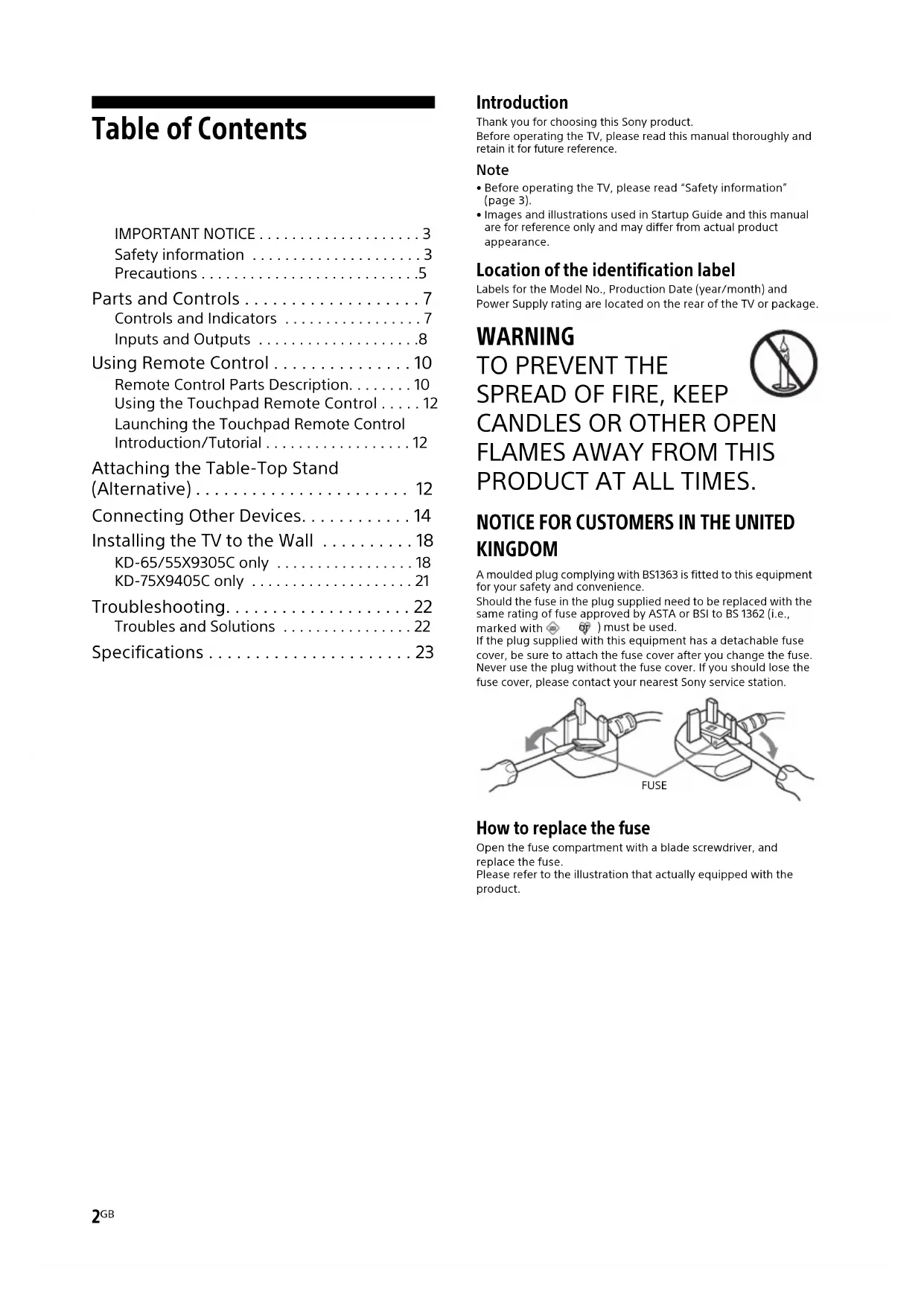 KINGDOM A moulded plug complying with BS1363 is fitted to this equipment for your safety and convenience.Should the fuse in the plug supplied need to be replaced with the same rating of fuse approved by ASTA or BSI to BS 1362 (i.e., marked with or ) must be used.If the plug supplied with this equipment has a detachable fuse cover, be sure to attach the fuse cover after you change the fuse. Never use the plug without the fuse cover. If you should lose the fuse cover, please contact your nearest Sony service station. How to replace the fuse Open the fuse compartment with a blade screwdriver, and replace the fuse.Please refer to the illustration that actually equipped with the product. FUSE3