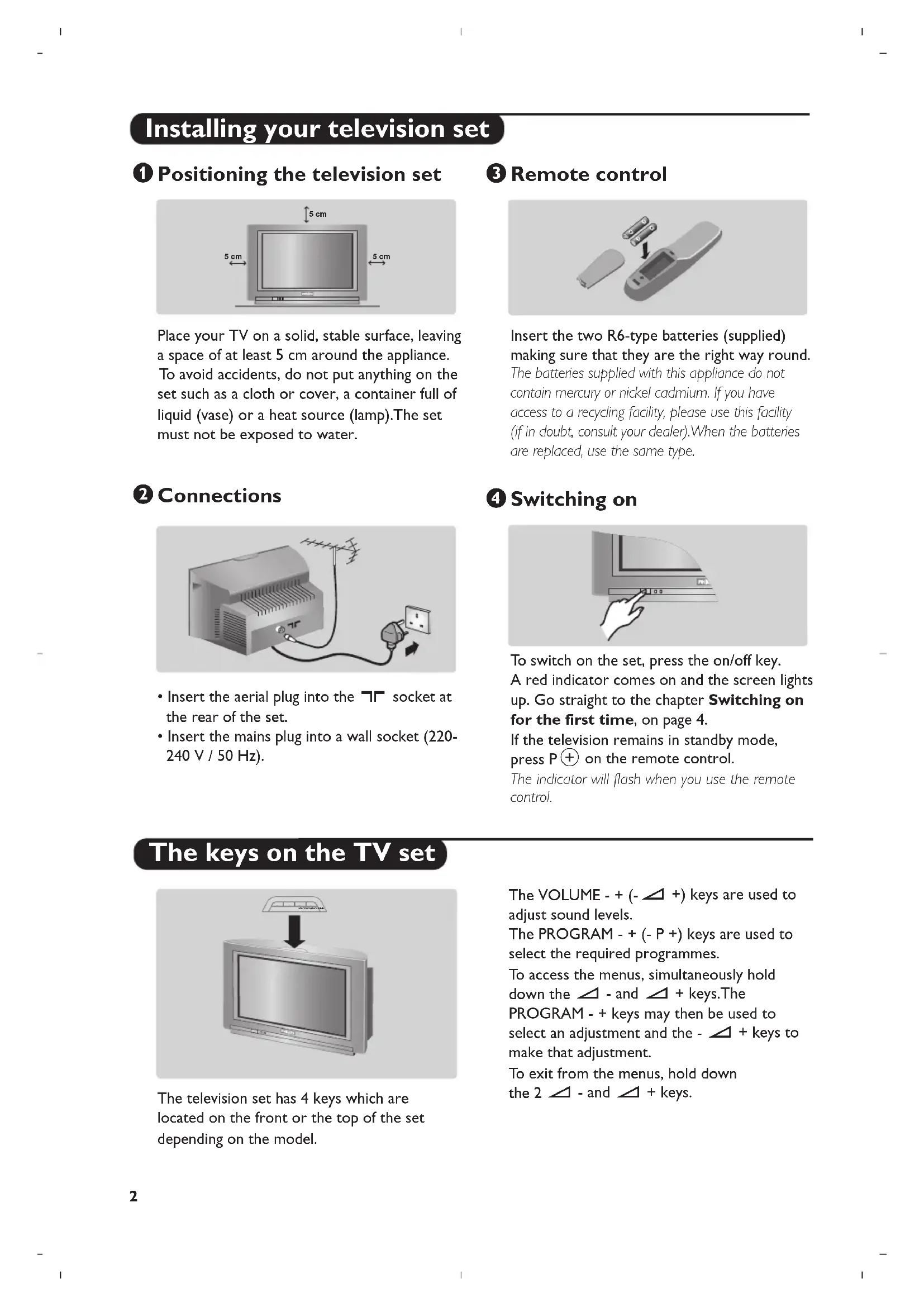 Switching on To switch on the set, press the on/off key. A red indicator comes on and the screen lights up. Go straight to the chapter Switching on for the first time, on page 4. If the television remains in standby mode, press P # on the remote control. The indicator will flash when you use the remote control. 5 cm 5 cm 5 cm Installing your television set The keys on the TV set3