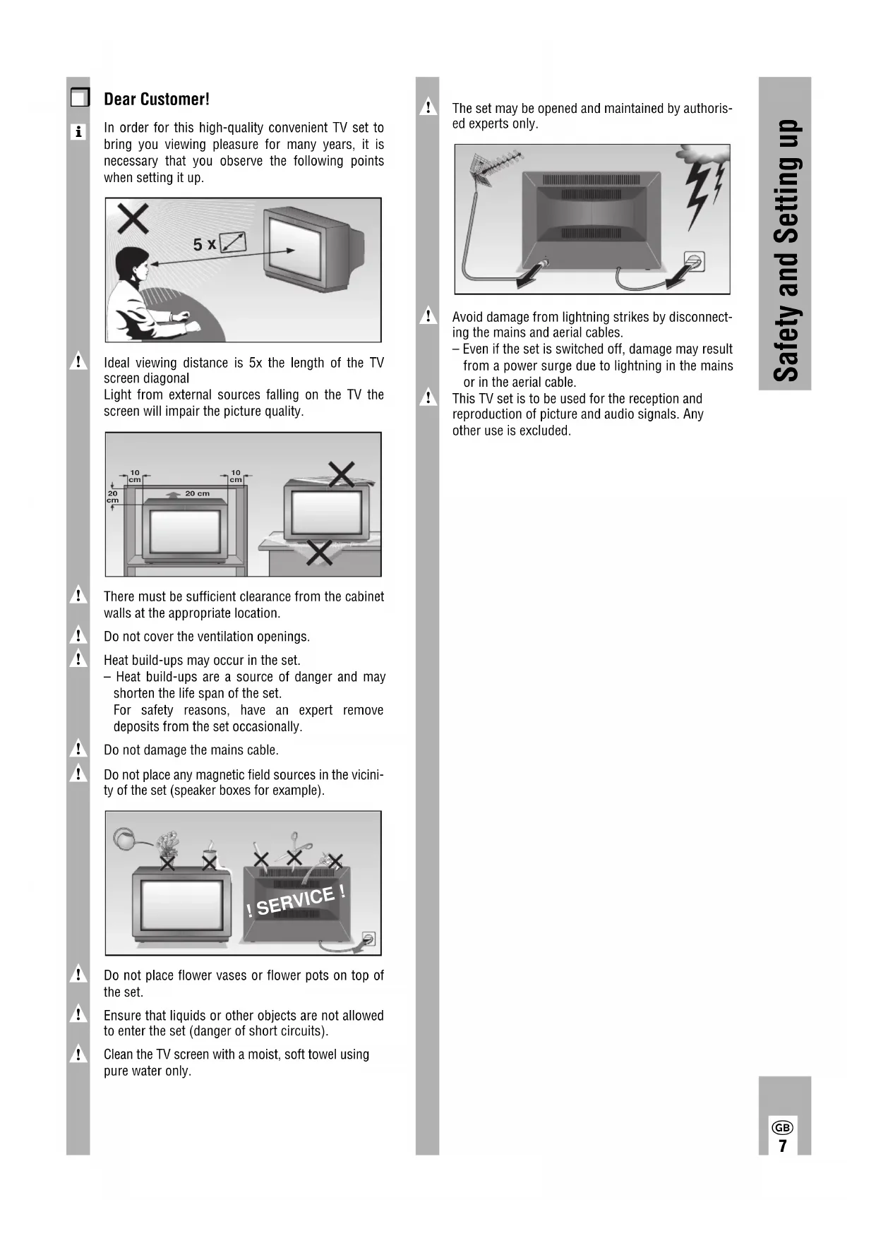 This TV set is to be used for the reception andreproduction of picture and audio signals. Anyother use is excluded. Dear Customer!In order for this high-quality convenient TV set tobring you viewing pleasure for many years, it isnecessary that you observe the following pointswhen setting it up.
