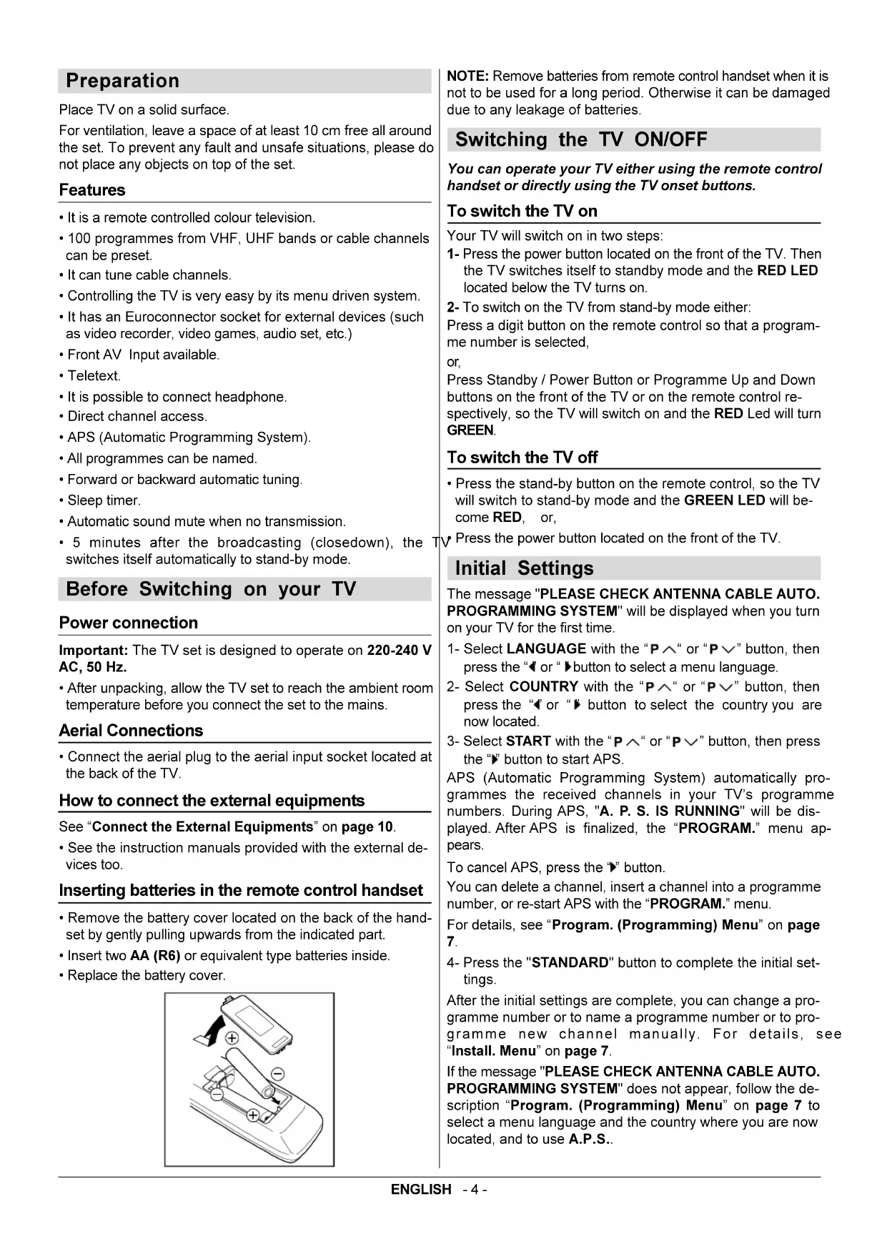 The lightning flash with arrowhead symbol, within an equilateral triangle, is intended to alert the user to the presence of uninsulated "dangerous voltage" within the product's enclosure that may be of sufficient magnitude to constitute a risk of electric shock of persons. The exclamation point within an equilateral triangle is intended to alert the user to the presence of important operating and maintenance (servicing) instructions in the literature accompanying the appliance.ENGLISH - 3 - Control Panel Buttons Antenna Connections AV14BM8ENS AV14BJ8ENSENGLISH - 4 - Preparation Place TV on a solid surface. For ventilation, leave a space of at least 10 cm free all around the set. To prevent any fault and unsafe situations, please do not place any objects on top of the set. Features It is a remote controlled colour television. 100 programmes from VHF, UHF bands or cable channels can be preset. It can tune cable channels. Controlling the TV is very easy by its menu driven system. It has an Euroconnector socket for external devices (such as video recorder, video games, audio set, etc.) Front AV Input available. Teletext. It is possible to connect headphone. Direct channel access. APS (Automatic Programming System). All programmes can be named. Forward or backward automatic tuning. Sleep timer. Automatic sound mute when no transmission. 5 minutes after the broadcasting (closedown), the TV switches itself automatically to stand-by mode. Before Switching on your TV Power connection Important: The TV set is designed to operate on 220-240 V AC, 50 Hz. After unpacking, allow the TV set to reach the ambient room temperature before you connect the set to the mains. Aerial Connections Connect the aerial plug to the aerial input socket located at the back of the TV. How to connect the external equipments See Connect the External Equipments on page 10. See the instruction manuals provided with the external de- vices too. Inserting batteries in the remote control handset Remove the battery cover located on the back of the hand- set by gently pulling upwards from the indicated part. Insert two AA (R6) or equivalent type batteries inside. Replace the battery cover. NOTE: Remove batteries from remote control handset when it is not to be used for a long period. Otherwise it can be damaged due to any leakage of batteries. Switching the TV ON/OFF You can operate your TV either using the remote control handset or directly using the TV onset buttons. To switch the TV on Your TV will switch on in two steps:
