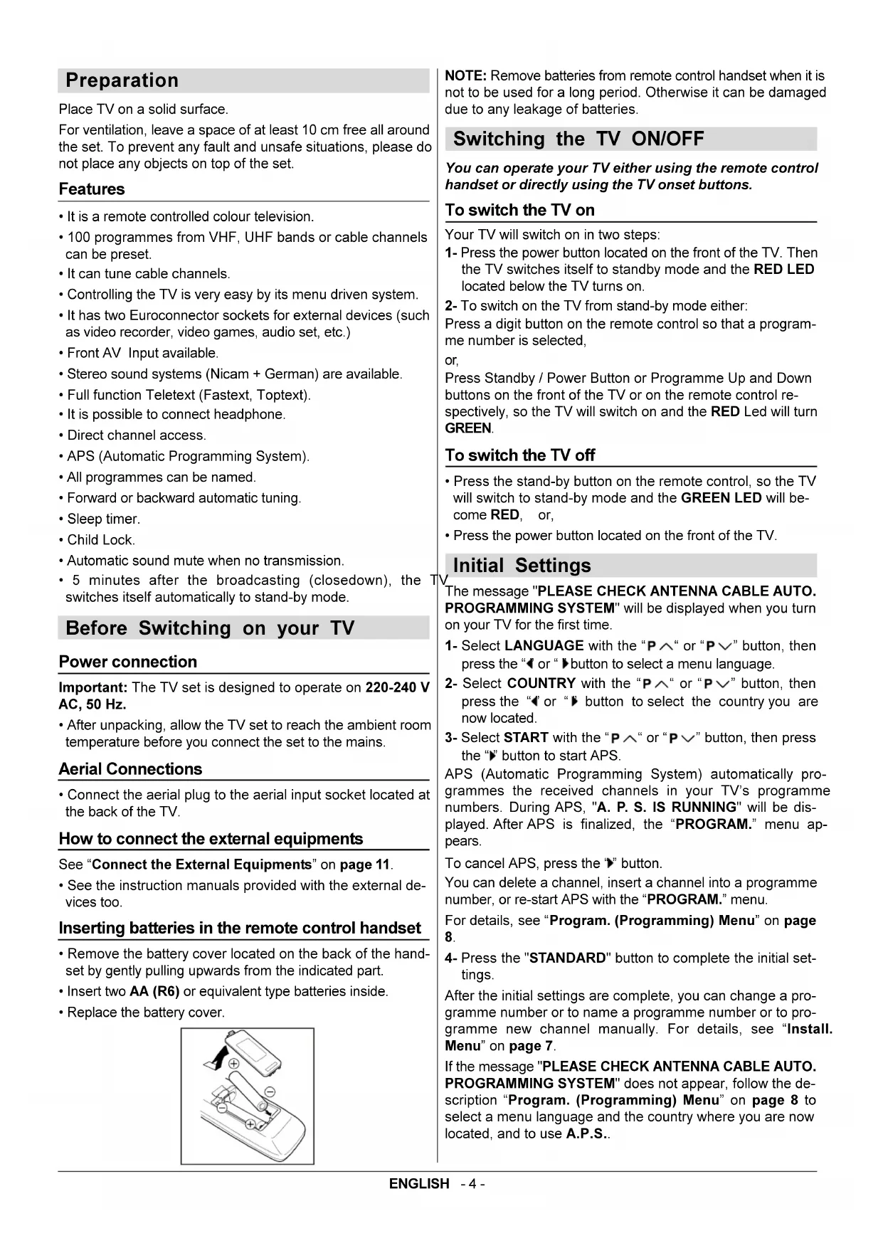 Preparation Place TV on a solid surface. For ventilation, leave a space of at least 10 cm free all around the set. To prevent any fault and unsafe situations, please do not place any objects on top of the set. Features It is a remote controlled colour television. 100 programmes from VHF, UHF bands or cable channels can be preset. It can tune cable channels. Controlling the TV is very easy by its menu driven system. It has two Euroconnector sockets for external devices (such as video recorder, video games, audio set, etc.) Front AV Input available. Stereo sound systems (Nicam + German) are available. Full function Teletext (Fastext, Toptext). It is possible to connect headphone. Direct channel access. APS (Automatic Programming System). All programmes can be named. Forward or backward automatic tuning. Sleep timer. Child Lock. Automatic sound mute when no transmission. 5 minutes after the broadcasting (closedown), the TV switches itself automatically to stand-by mode. Before Switching on your TV Power connection Important: The TV set is designed to operate on 220-240 V AC, 50 Hz. After unpacking, allow the TV set to reach the ambient room temperature before you connect the set to the mains. Aerial Connections Connect the aerial plug to the aerial input socket located at the back of the TV. How to connect the external equipments See Connect the External Equipments on page 11. See the instruction manuals provided with the external de- vices too. Inserting batteries in the remote control handset Remove the battery cover located on the back of the hand- set by gently pulling upwards from the indicated part. Insert two AA (R6) or equivalent type batteries inside. Replace the battery cover. NOTE: Remove batteries from remote control handset when it is not to be used for a long period. Otherwise it can be damaged due to any leakage of batteries. Switching the TV ON/OFF You can operate your TV either using the remote control handset or directly using the TV onset buttons. To switch the TV on Your TV will switch on in two steps: