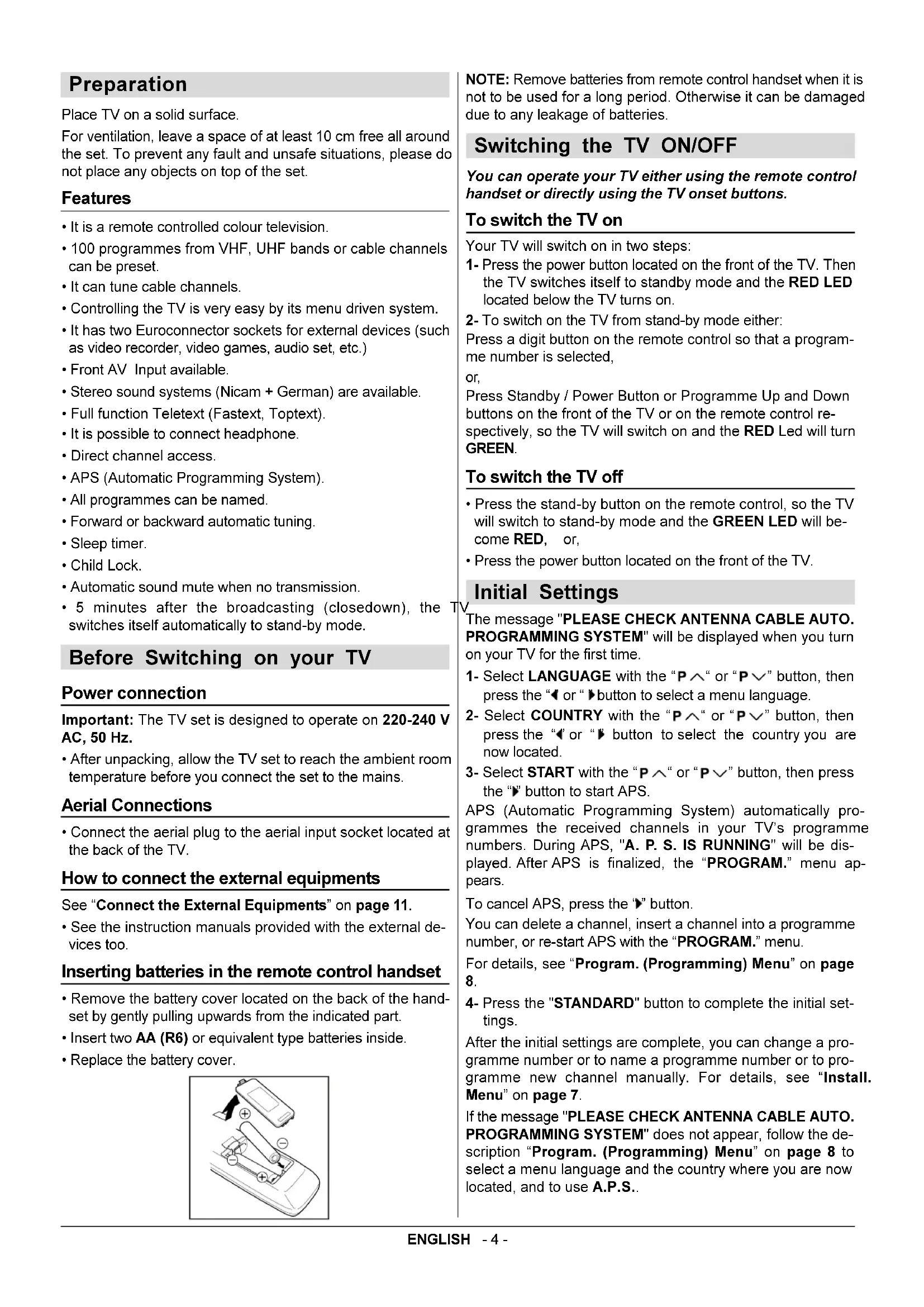 Preparation Place TV on a solid surface. For ventilation, leave a space of at least 10 cm free all around the set. To prevent any fault and unsafe situations, please do not place any objects on top of the set. Features It is a remote controlled colour television. 100 programmes from VHF, UHF bands or cable channels can be preset. It can tune cable channels. Controlling the TV is very easy by its menu driven system. It has two Euroconnector sockets for external devices (such as video recorder, video games, audio set, etc.) Front AV Input available. Stereo sound systems (Nicam + German) are available. Full function Teletext (Fastext, Toptext). It is possible to connect headphone. Direct channel access. APS (Automatic Programming System). All programmes can be named. Forward or backward automatic tuning. Sleep timer. Child Lock. Automatic sound mute when no transmission. 5 minutes after the broadcasting (closedown), the TV switches itself automatically to stand-by mode. Before Switching on your TV Power connection Important: The TV set is designed to operate on 220-240 V AC, 50 Hz. After unpacking, allow the TV set to reach the ambient room temperature before you connect the set to the mains. Aerial Connections Connect the aerial plug to the aerial input socket located at the back of the TV. How to connect the external equipments See Connect the External Equipments on page 11. See the instruction manuals provided with the external de- vices too. Inserting batteries in the remote control handset Remove the battery cover located on the back of the hand- set by gently pulling upwards from the indicated part. Insert two AA (R6) or equivalent type batteries inside. Replace the battery cover. NOTE: Remove batteries from remote control handset when it is not to be used for a long period. Otherwise it can be damaged due to any leakage of batteries. Switching the TV ON/OFF You can operate your TV either using the remote control handset or directly using the TV onset buttons. To switch the TV on Your TV will switch on in two steps: