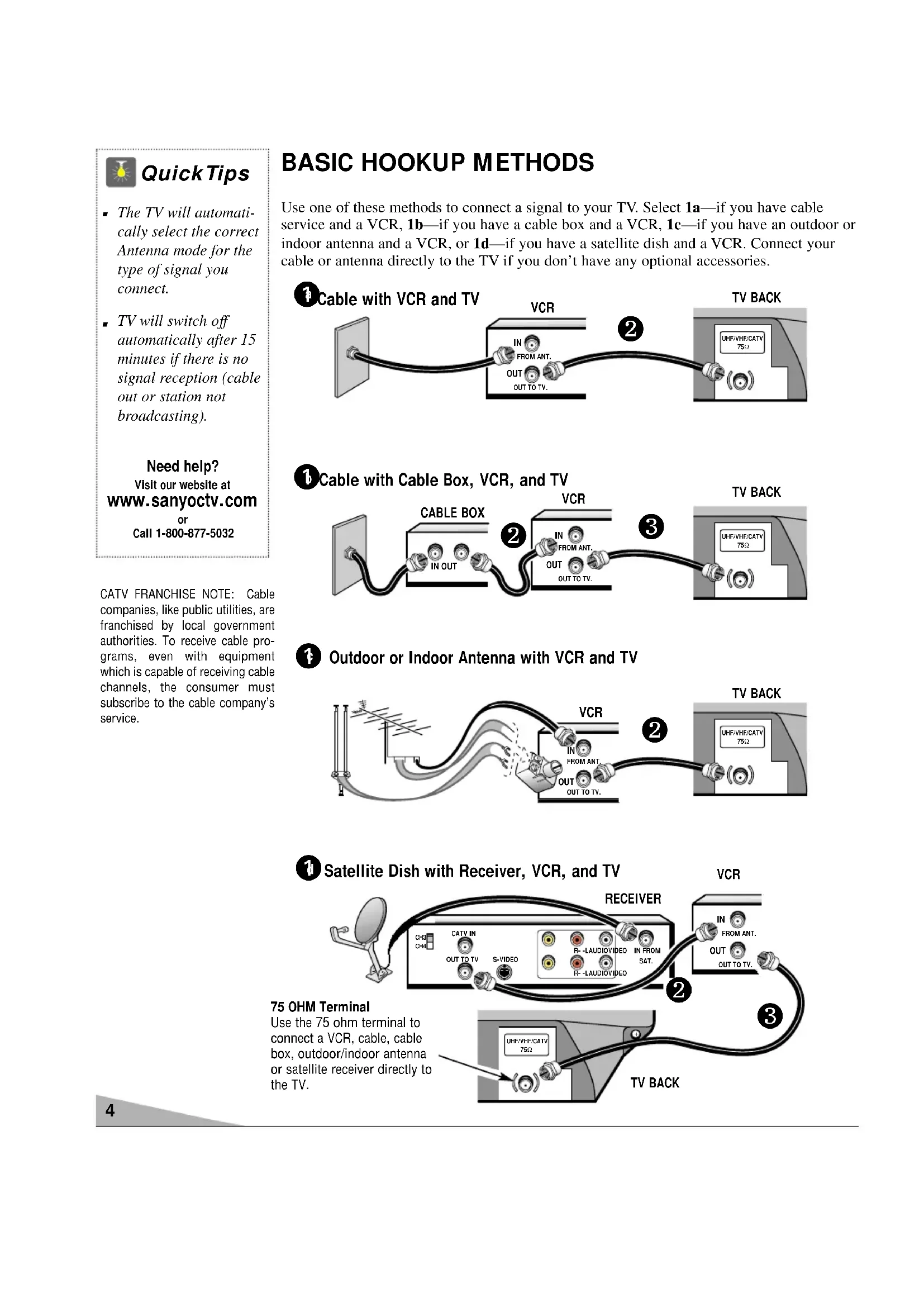 The TV will automat- ically select the correct Antenna mode for the type of signal you connect. Need help? Visit our website at www.sanyoctv.com