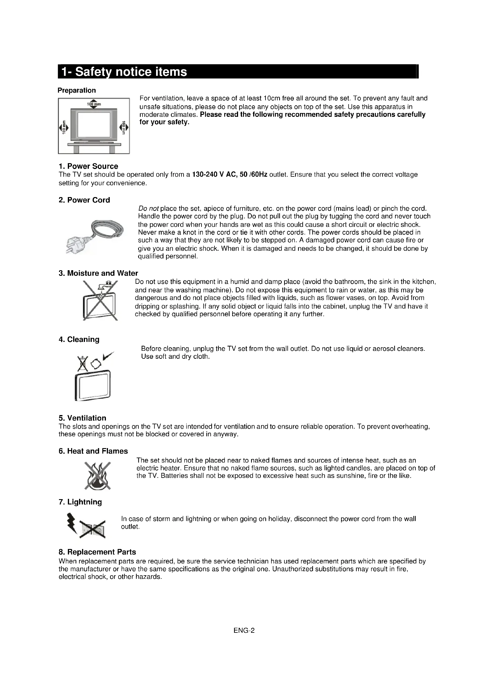 When replacement parts are required, be sure the service technician has used replacement parts which are specified by the manufacturer or have the same specifications as the original one. Unauthorized substitutions may result in fire, electrical shock, or other hazards.ENG-3
