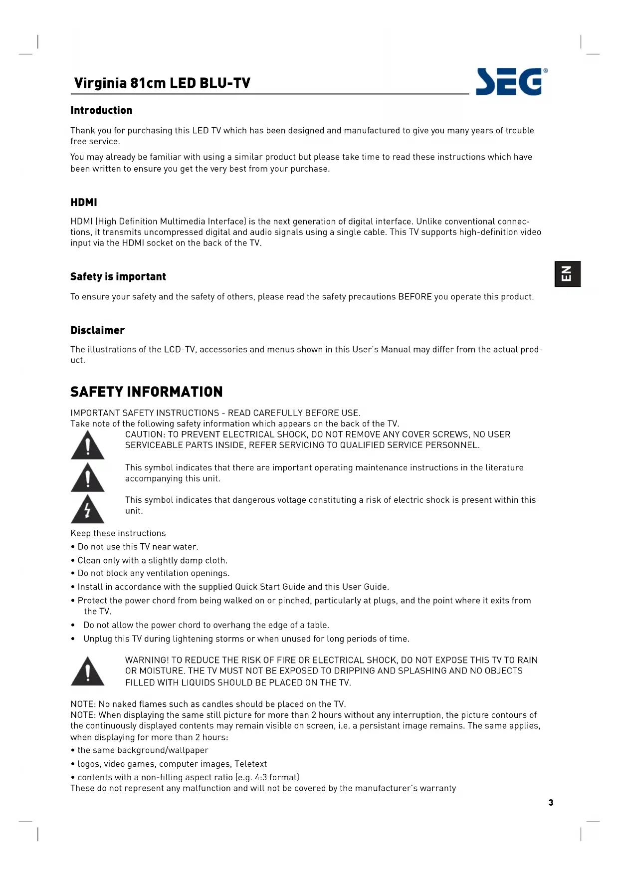 - contHQWVZLWKDQRQéOOLQJDVSHFWratio (e.g. 4:3 format) These do not represent any malfunction and will not be covered by the manufacturer’s warranty Virginia 81cm LED BLU-TV4 This unit has been produced according to all current safety regulations. The following safety tips should safeguard users against careless use and the dangers connected with such use.