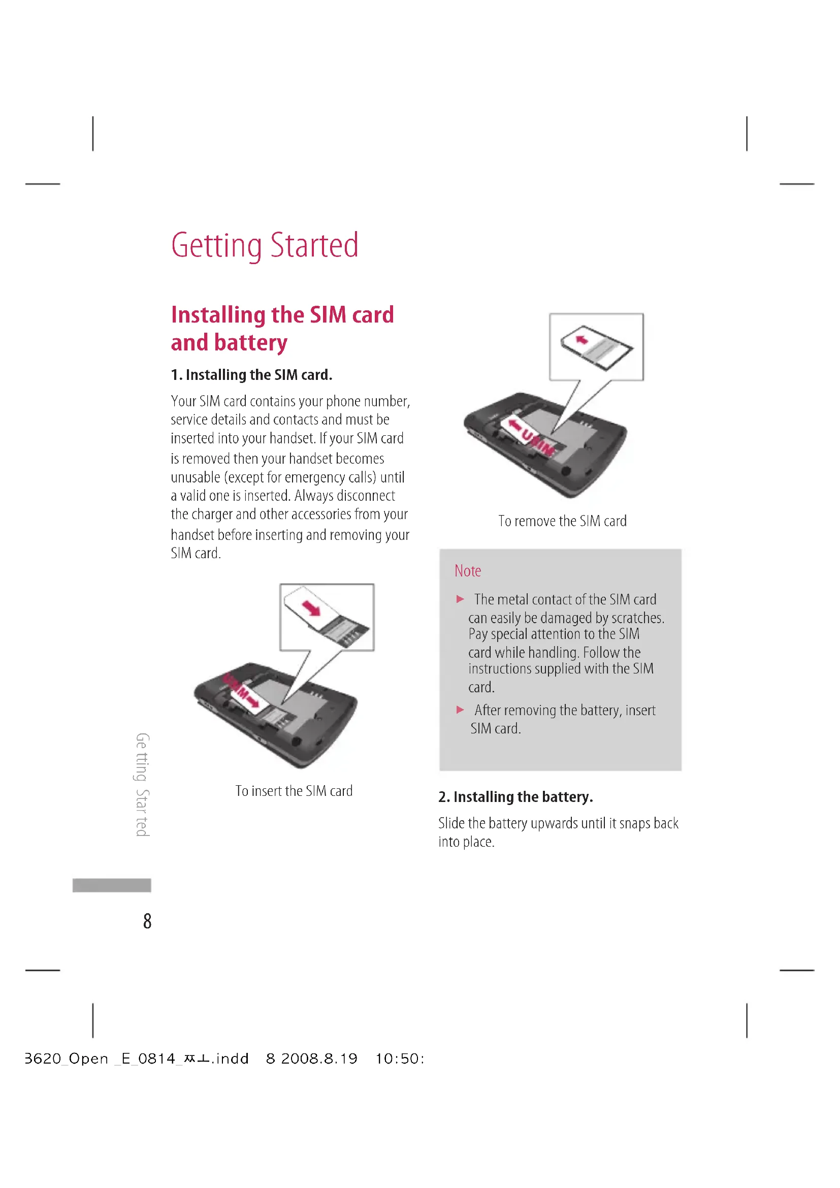 The metal contact of the SIM card can easily be damaged by scratches. Pay special attention to the SIM card while handling. Follow the instructions supplied with the SIM card. After removing the battery, insert SIM card.2. Installing the battery.Slide the battery upwards until it snaps back into place. KB620_Open _E_0814_쪼.indd 8 2008.8.19 10:50:18 AM9 Getting Started