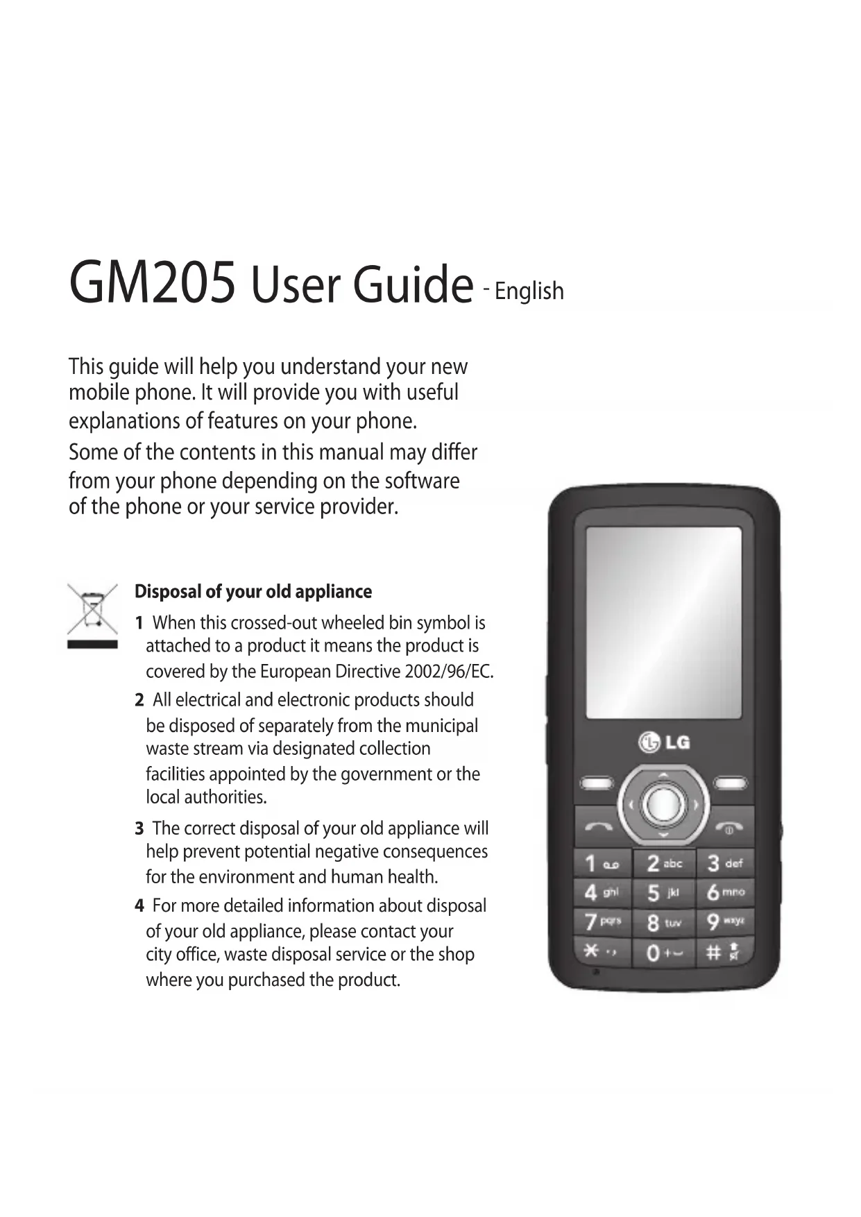 English This guide will help you understand your new mobile phone. It will provide you with useful explanations of features on your phone. Some of the contents in this manual may differ from your phone depending on the software of the phone or your service provider. Disposal of your old appliance 1 When this crossed-out wheeled bin symbol is attached to a product it means the product is covered by the European Directive 2002/96/EC. 2 All electrical and electronic products should be disposed of separately from the municipal waste stream via designated collection facilities appointed by the government or the local authorities. 3 The correct disposal of your old appliance will help prevent potential negative consequences for the environment and human health. 4 For more detailed information about disposal of your old appliance, please contact your city office, waste disposal service or the shop where you purchased the product.2 Getting to know your phone Charger, cable slot Call key Dials a phone number and answers incoming calls. End/Power key Ends or rejects a call. Turns the phone on/off. Returns to the standby screen when you use the menu. Main screen Volume key Memory card slot Handsfree connector3 Installing a memory card Lift the memory card cover and insert a micro SD card with the golden contact area facing downwards. Close the memory card cover so that it clicks shut. To remove the memory card, gently push it as shown in the diagram. Note: A memory card is an optional accessory. The GM205 will support up to a 2GB memory card. Formatting the memory card Press Menu and select Settings. Choose Memory status, select External memory and press Format.