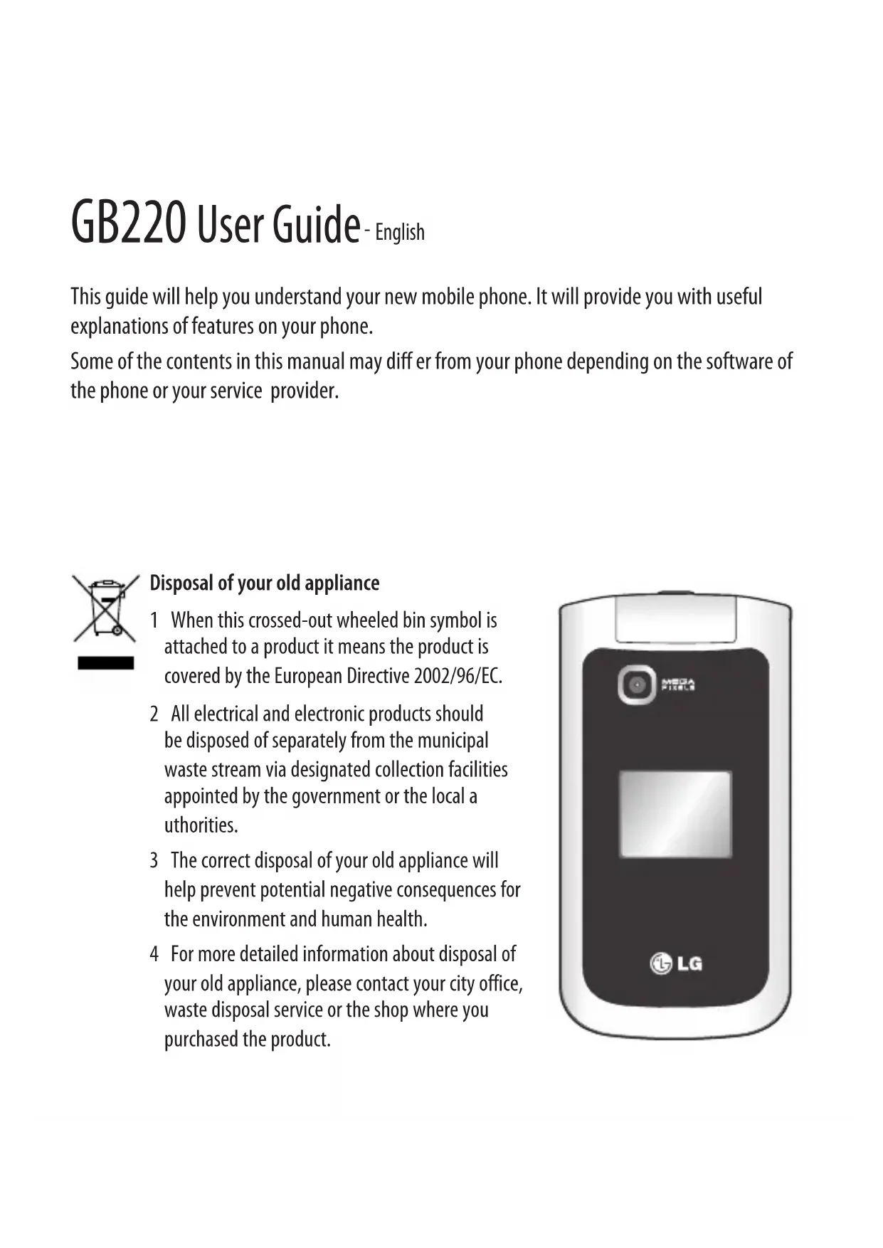 Download the instructions for your Mobile Phone in PDF format for free! Find your manual GB220 - LG and take your electronic device back in hand. On this page are published all the documents necessary for the use of your device. GB220 by LG.
