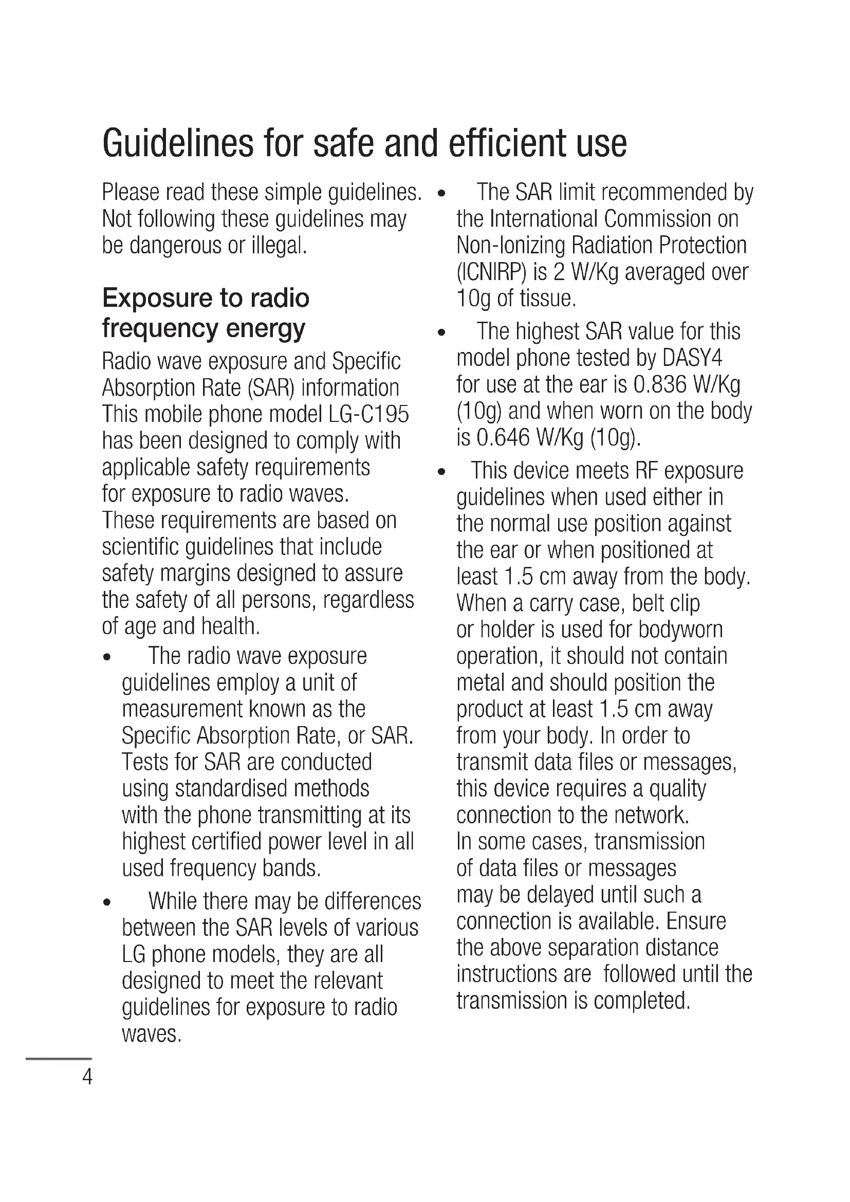 - This device meets RF exposure guidelines when used either in the normal use position against the ear or when positioned at least 1.5 cm away from the body. When a carry case, belt clip or holder is used for bodyworn operation, it should not contain metal and should position the product at least 1.5 cm away from your body. In order to transmit data files or messages, this device requires a quality connection to the network. In some cases, transmission of data files or messages may be delayed until such a connection is available. Ensure the above separation distance instructions are followed until the transmission is completed. Guidelines for safe and efficient use5 Product care and maintenance