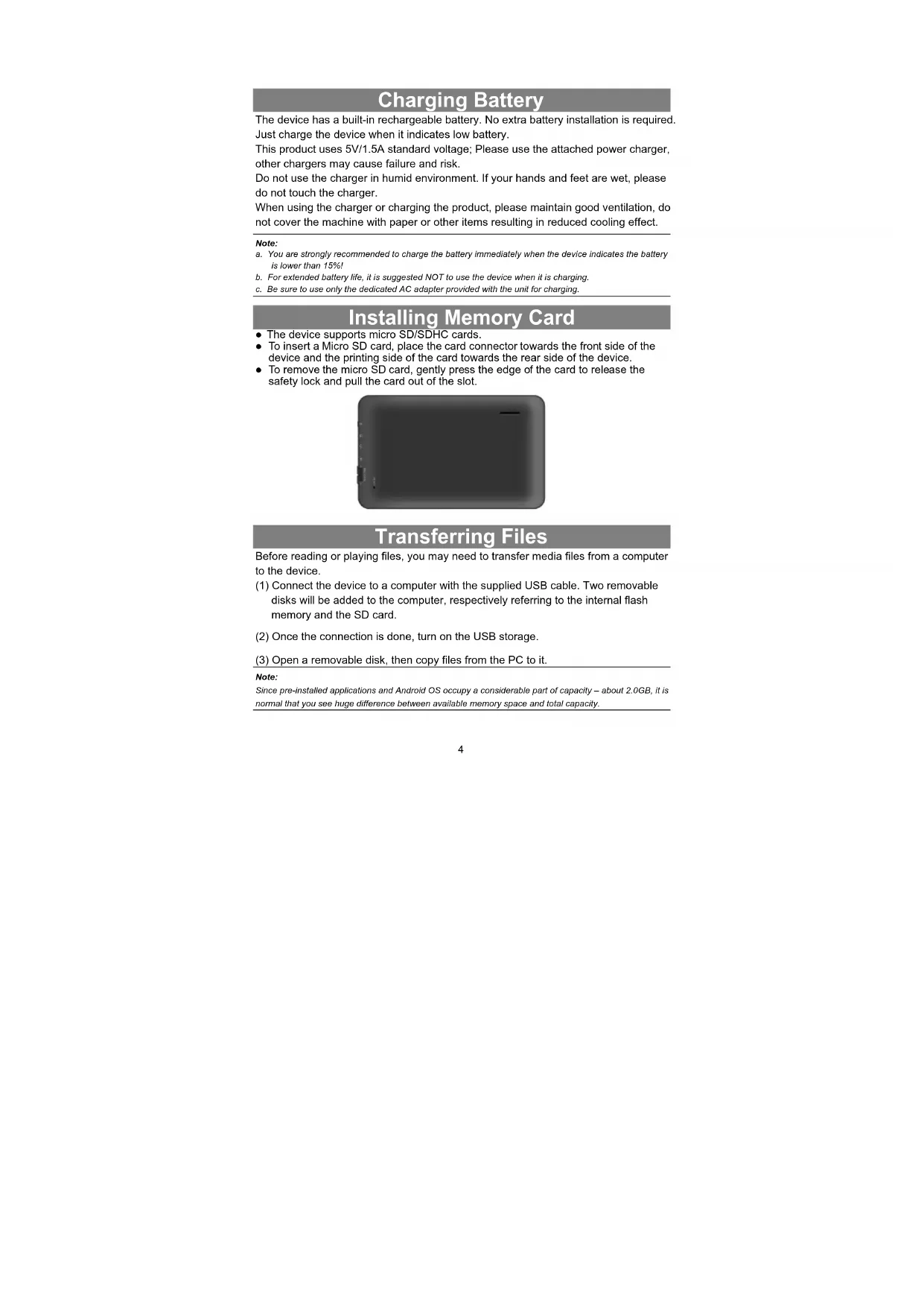 Charging Battery The device has a built-in rechargeable battery. No extra battery installation is required. Just charge the device when it indicates low battery. This product uses 5V/1.5A standard voltage; Please use the attached power charger, other chargers may cause failure and risk. Do not use the charger in humid environment. If your hands and feet are wet, please do not touch the charger. When using the charger or charging the product, please maintain good ventilation, do not cover the machine with paper or other items resulting in reduced cooling effect. Note: a. You are strongly recommended to charge the battery immediately when the device indicates the battery is lower than 15%! b. For extended battery life, it is suggested NOT to use the device when it is charging. c. Be sure to use only the dedicated AC adapter provided with the unit for charging. Installing Memory Card The device supports micro SD/SDHC cards. To insert a Micro SD card, place the card connector towards the front side of the device and the printing side of the card towards the rear side of the device. To remove the micro SD card, gently press the edge of the card to release the safety lock and pull the card out of the slot.