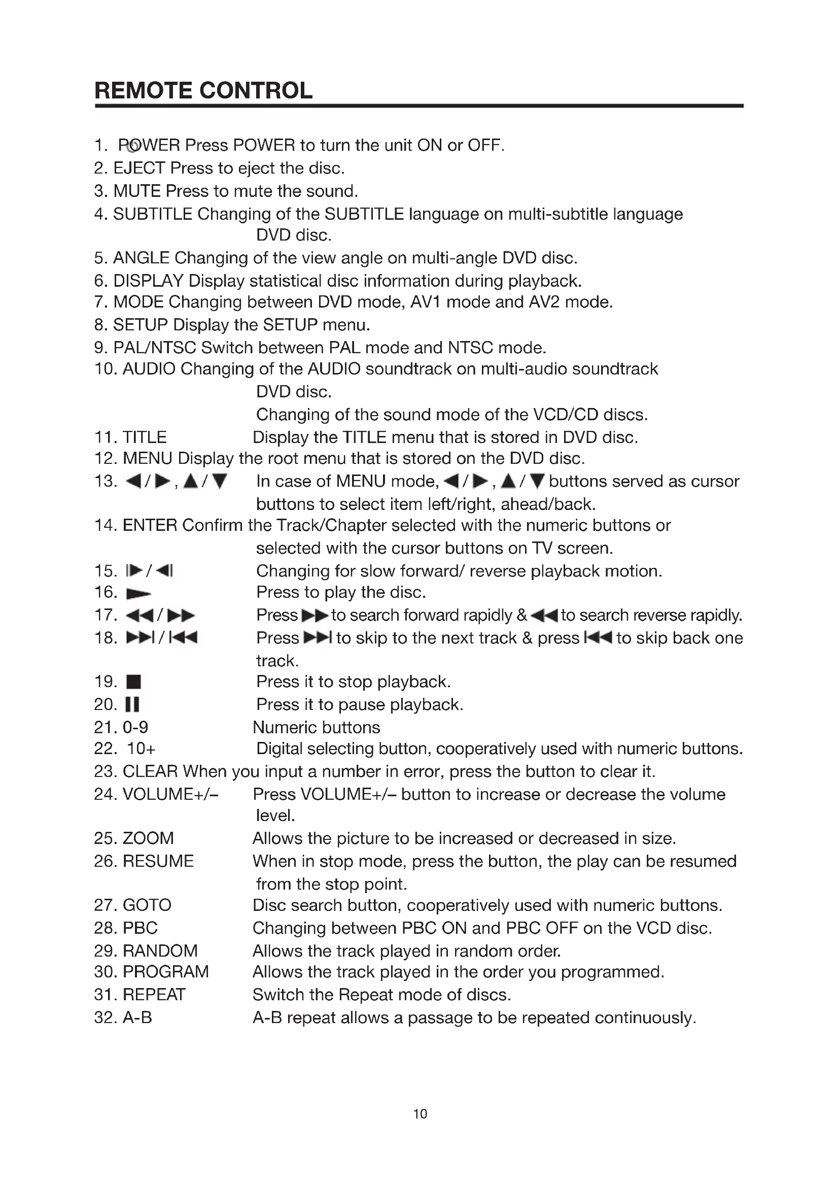 REPEAT OFF FOR VCD/CD: Press the REPEAT button to select repeat mode as follow.