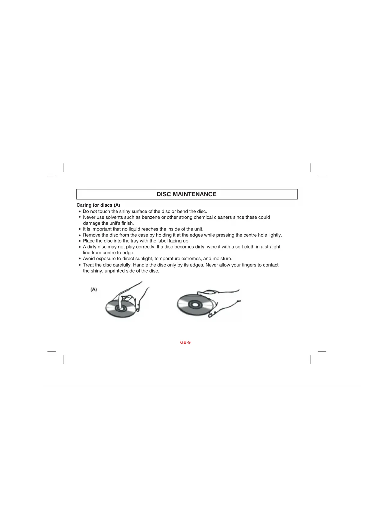 Audio Audio or Video Audio or Video Audio or Video Audio or Video Audio or Video Audio or VideoGB-9 DISC MAINTENANCE Caring for discs (A) Do not touch the shiny surface of the disc or bend the disc. Never use solvents such as benzene or other strong chemical cleaners since these could damage the unit's finish. It is important that no liquid reaches the inside of the unit. Remove the disc from the case by holding it at the edges while pressing the centre hole lightly. Place the disc into the tray with the label facing up. A dirty disc may not play correctly. If a disc becomes dirty, wipe it with a soft cloth in a straight line from centre to edge. Avoid exposure to direct sunlight, temperature extremes, and moisture. Treat the disc carefully. Handle the disc only by its edges. Never allow your fingers to contact the shiny, unprinted side of the disc.GB-10 Clean the discs (B) Do not attach adhesive tape, stickers, etc. to the disc label. Clean the disc periodically with a soft, lint-free, dry cloth. Never use detergents or abrasive cleaners to clean the disc. If necessary, use a CD cleaning kit. If a disc skips or gets stuck on a section of the disc, it is probably dirty or damaged (scratched). When cleaning the disc, wipe in straight lines from the centre of the disc to the outer edge of the disc. Never wipe in circular motions. (B) Correct Incorrect Discs should be stored in their cases after each use to avoid damage. Do not expose discs to direct sunlight, high temperatures or dust, etc. Prolonged exposure or extreme temperatures can warp the disc. Do not stick or write anything on either side of the disc. Sharp writing instruments, or ink, may damage the surface.GB-11 IMPORTANT NOTE: The functions described below are mainly only available for DVD discs unless specified otherwise, i.e. audio CD. The on-screen messages and operations may be different for other type of discs. Play / Stop