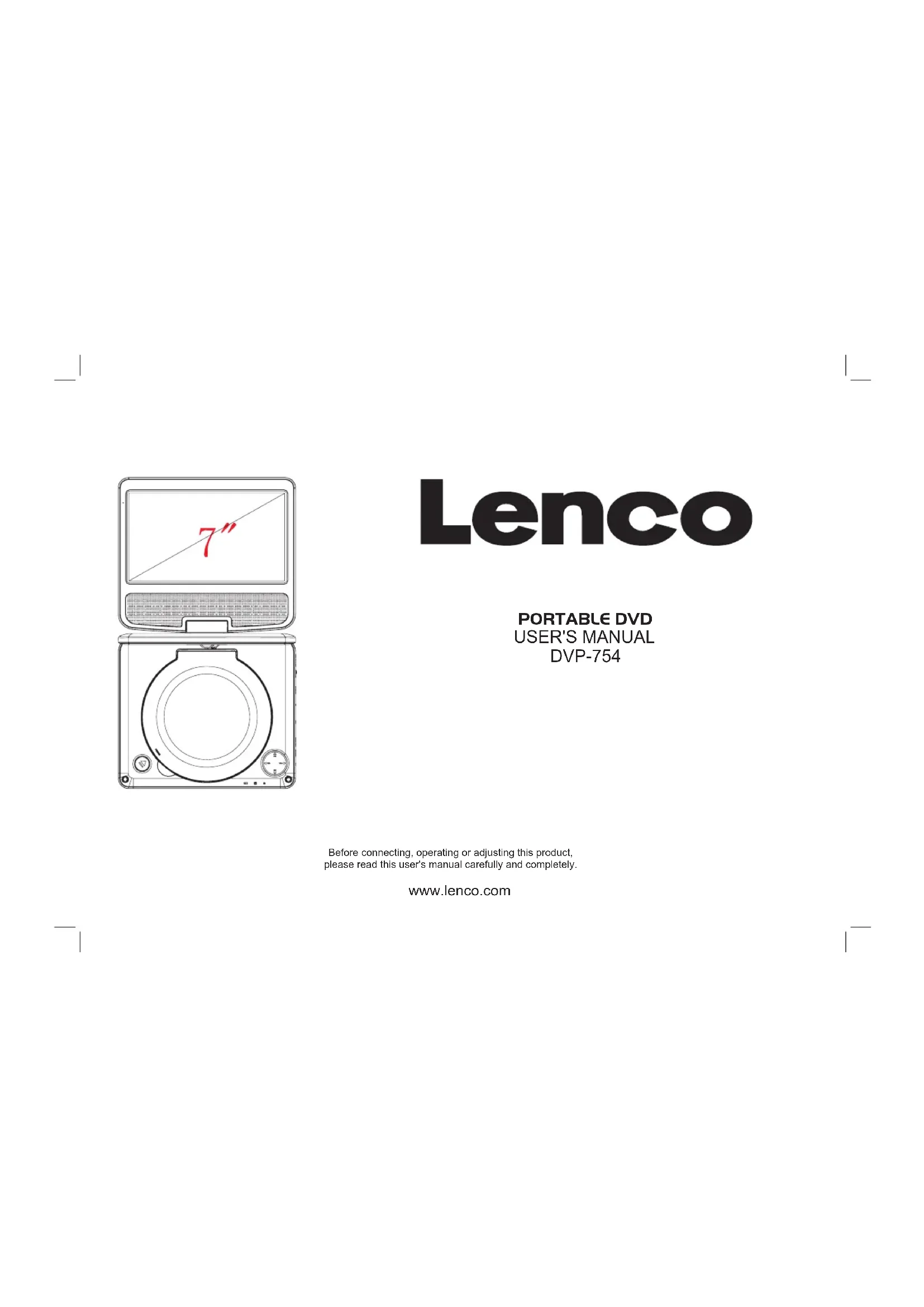 Before connecting, operating or adjusting this product, please read this user's manual carefully and completely. PORTABLE DVD USER'S MANUAL DVP-754 www.lenco.comWarning: To reduce the risk of electric shock, do not remove the cover or back. There are no user-serviceable parts inside. Refer servicing to qualified personnel.