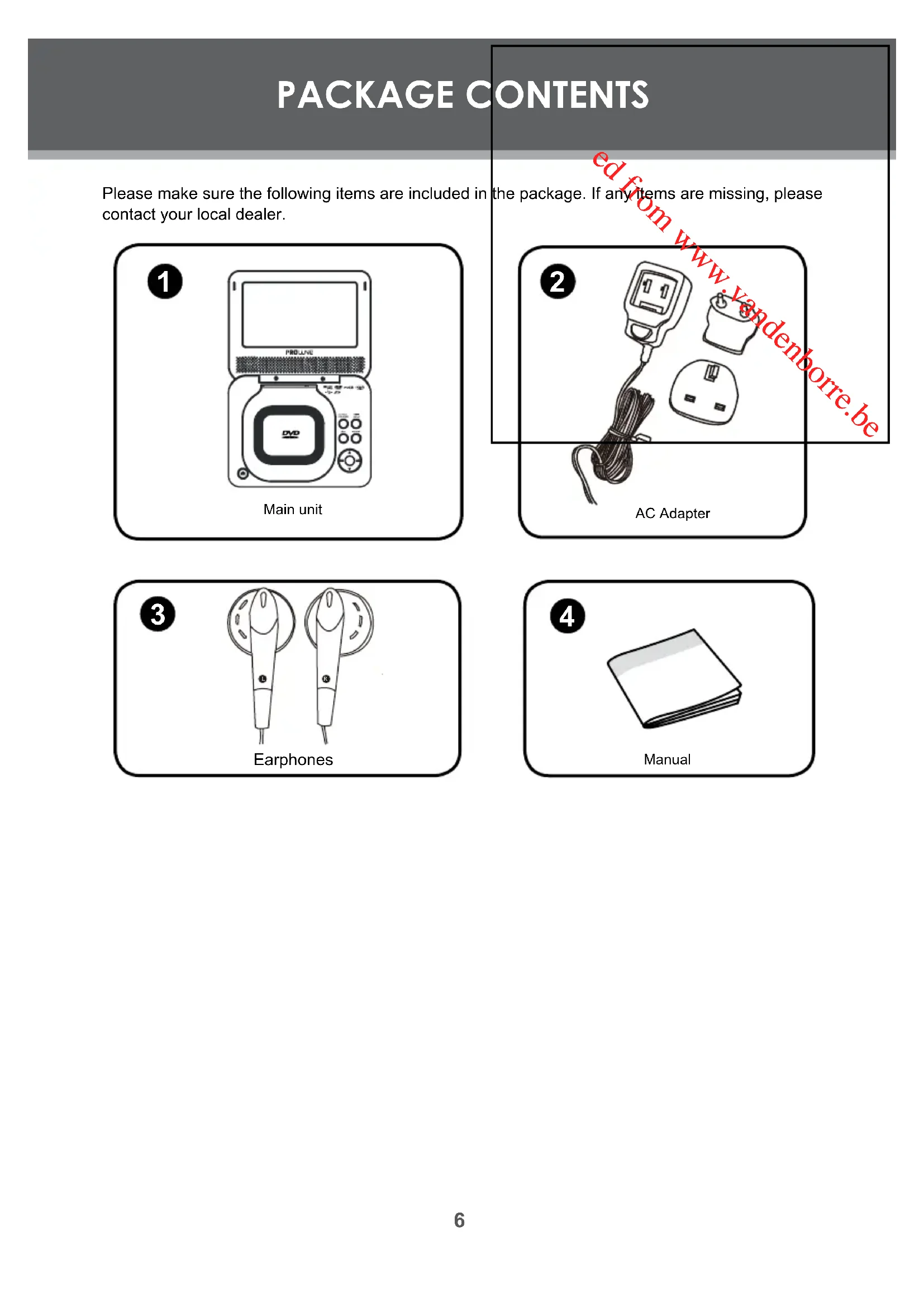 These safety and operating instructions should be read before the product is operated. These safety and operating instructions should be retained for future reference. Do not use this product near water e.g. near a bath tub, washbowl, kitchen sink, laundry tub, in wet basements or near a swimming pool. The product should be situated away from heat sources such as radiators, heating vents, stoves and other products (including amplifiers ) that produce heat. If a car power adapter is used, always disconnect when not in use. This unit is not suitable for 24V vehicles. This product should not be used by the driver of a moving motor vehicle, or left unsecured whilst the vehicle is moving. If this unit is being used by a passenger in your vehicle be sure that it is secured or held safely and does not obstruct any safety device i.e. air bag , seat belt etc. Never push objects of any kind into this product through openings as they may touch dangerous voltage points or may short out parts that could result in fire or electric shock. The power adapter is the main disconnect device and should be accessible at all times. Do not attempt to repair this unit yourself; always get a qualified service agent to carry out any adjustments or repairs. Cleaning Unplug this product from the mains socket before cleaning. To clean the player, use a soft, dry cloth. If the surfaces are extremely dirty, use a soft cloth lightly moistened with a mild detergent solution. Do not use strong solvents such as alcohol, benzene or thinner, as these might damage the surface of the unit. Ventilation Do not obstruct the ventilation slots, including those underneath with soft furnishings. Overheating will shorten the life of this product and increase the risk of fire. WARNINGS This appliance is intended for domestic household use only and should not be used for any other purpose or in any other application, such as for non-domestic use or in a commercial environment. The apparatus shall not be exposed to dripping or splashing and that no objects filled with liquids, such as vases shall be placed on the apparatus. No naked flame sources, such as lighted candles should be placed on the apparatus. The ventilation shall not be impeded by covering the ventilati on openings with items, such as newspapers, table -cloths, curtains etc. 3Downloaded from www.vandenborre.beDownloaded from www.vandenborre.be