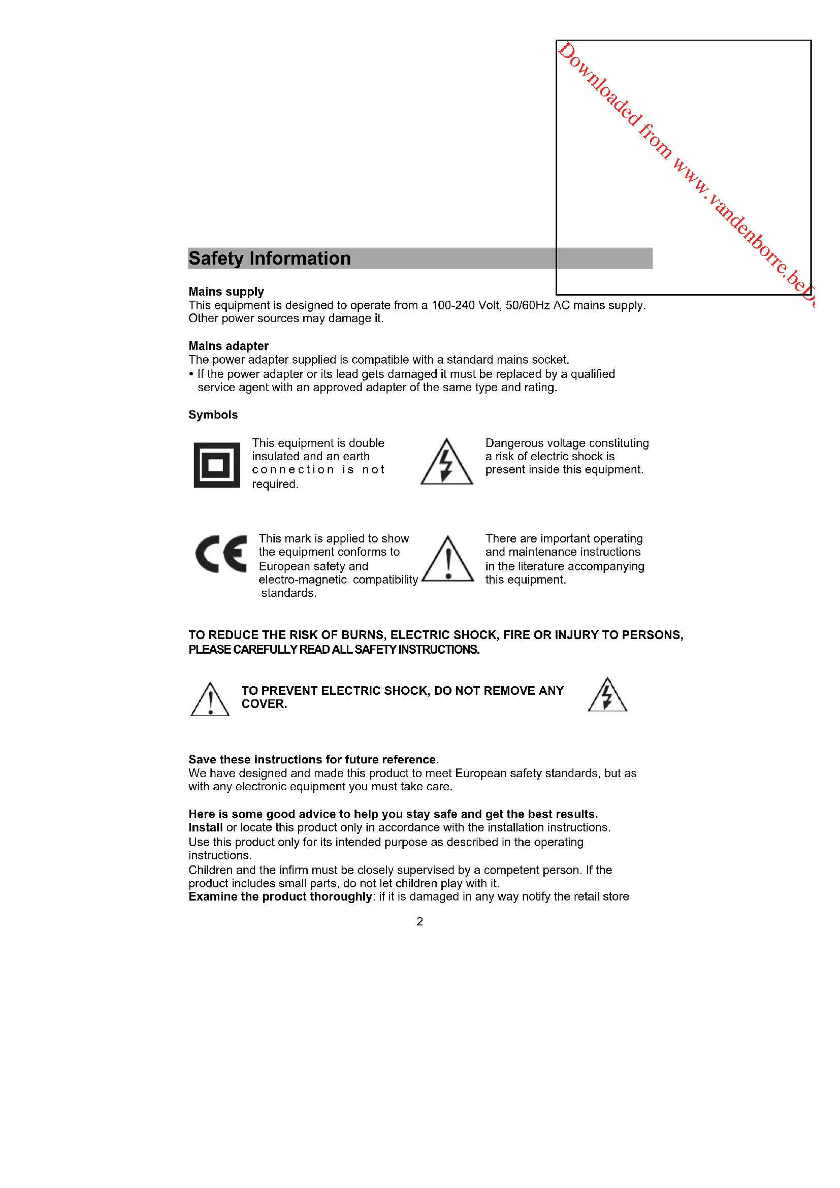 This equipment is double insulated and an earth connection is not required. Dangerous voltage constituting a risk of electric shock is present inside this equipment. This mark is applied to show the equipment conforms to European safety and electro-magnetic compatibility standards. There are important operating and maintenance instructions in the literature accompanying this equipment. TO REDUCE THE RISK OF BURNS, ELECTRIC SHOCK, FIRE OR INJURY TO PERSONS, PLEASE CAREFULLY READ ALL SAFETY INSTRUCTIONS. TO PREVENT ELECTRIC SHOCK, DO NOT REMOVE ANY COVER. Save these instructions for future reference. We have designed and made this product to meet European safety standards, but as with any electronic equipment you must take care. Here is some good advice to help you stay safe and get the best results. Install or locate this product only in accordance with the installation instructions. Use this product only for its intended purpose as described in the operating instructions. Children and the infirm must be closely supervised by a competent person. If the product includes small parts, do not let children play with it. Examine the product thoroughly: if it is damaged in any way notify the retail storeDownloaded from www.vandenborre.beDownloaded from www.vandenborre.be