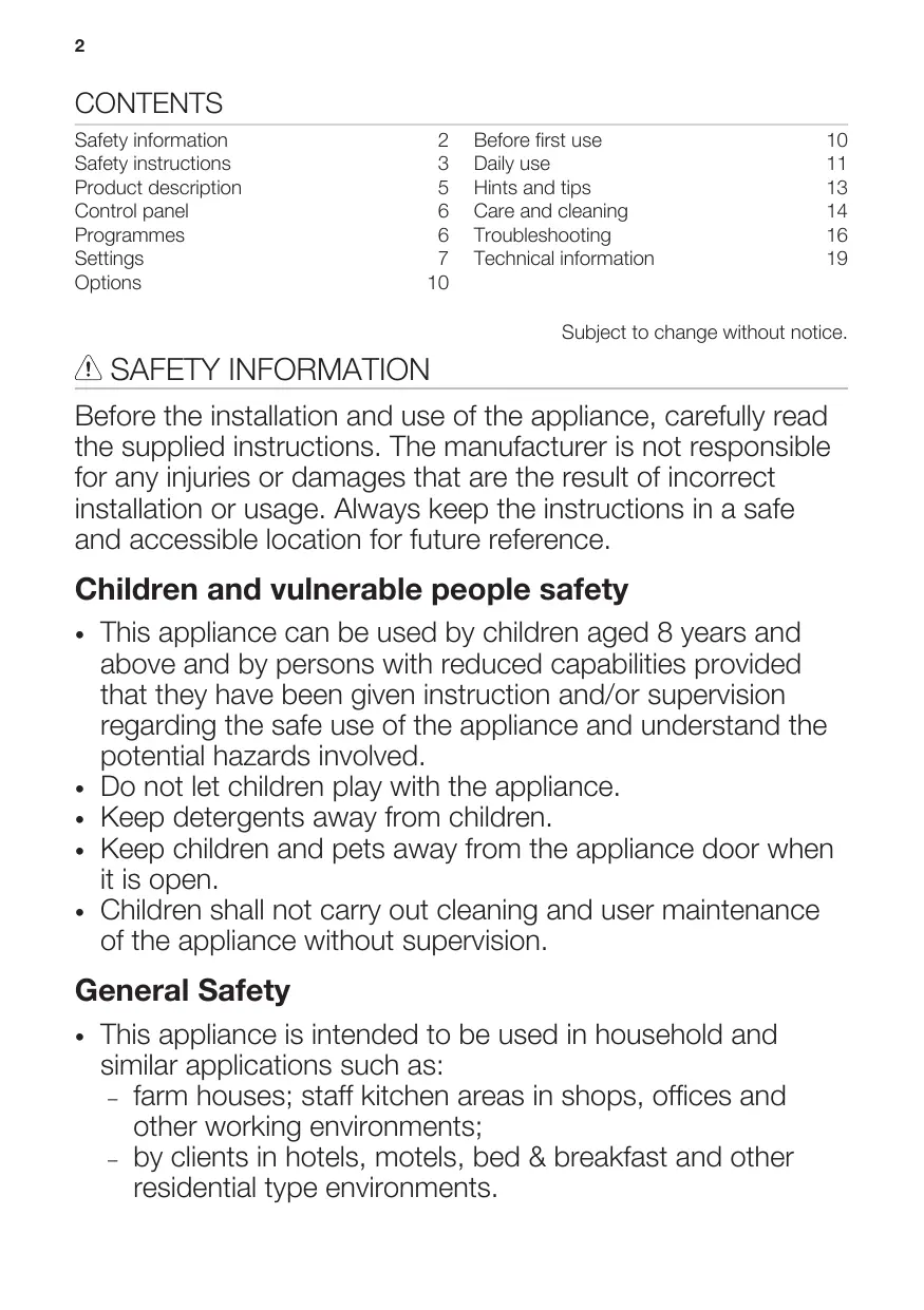 Subject to change without notice. SAFETY INFORMATION Before the installation and use of the appliance, carefully read the supplied instructions. The manufacturer is not responsible for any injuries or damages that are the result of incorrect installation or usage. Always keep the instructions in a safe and accessible location for future reference. Children and vulnerable people safety