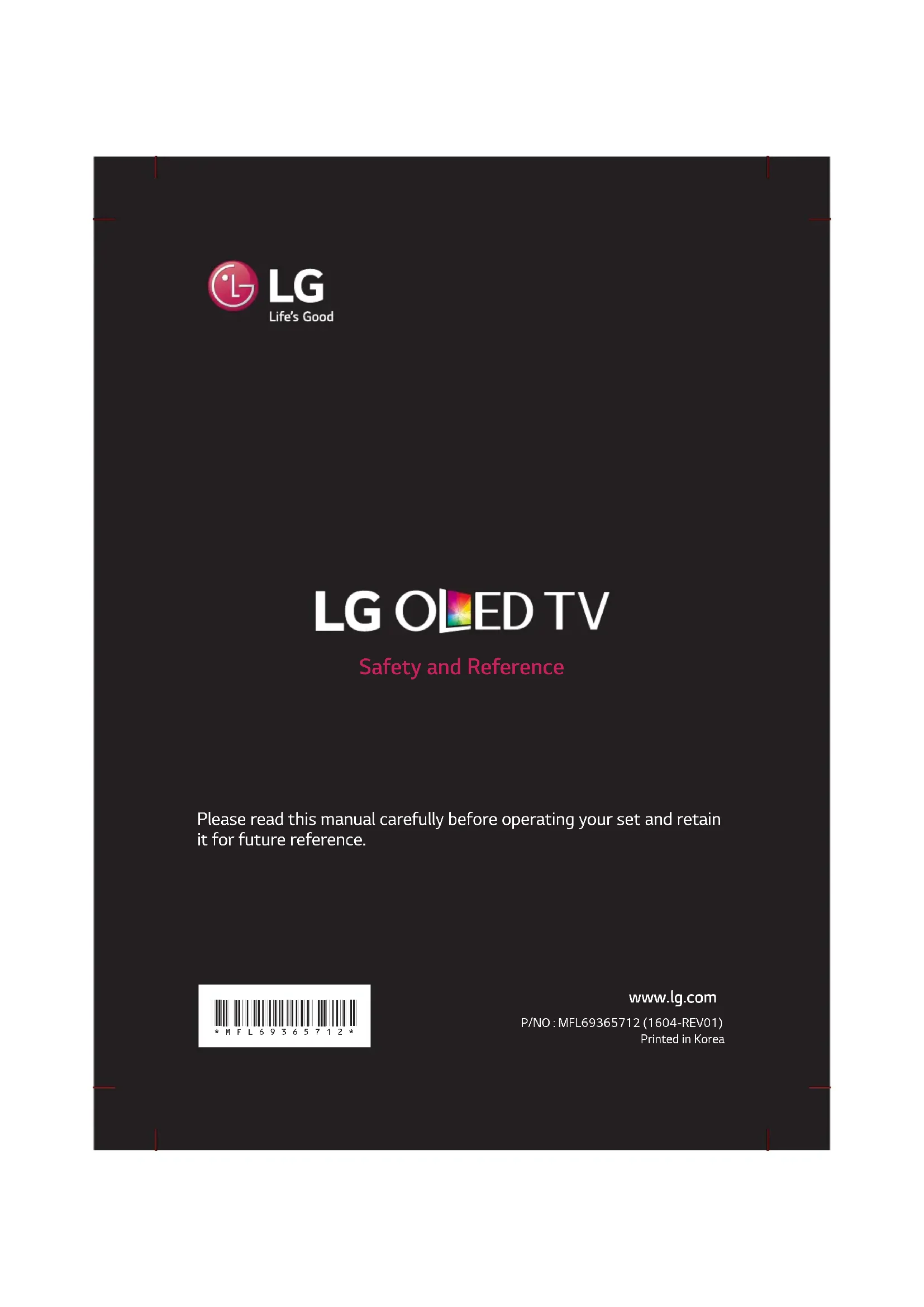 Please read this manual carefully before operating your set and retain it for future reference. www.lg.com P/NO : MFL69365712 (1604-REV01) Printed in Korea *MFL69365712* Safety and Reference2 ENGLISH Safety instructions Please read these safety precautions carefully before using the product. WARNING Do not place the TV and/or remote control in the following environments: tA location exposed to direct sunlight tAn area with high humidity such as a bathroom tNear any heat source such as stoves and other devices that produce heat tNear kitchen counters or humidiers where they can easily be exposed to steam or oil tAn area exposed to rain or wind tNear containers of water such as vases Otherwise, this may result in re, electric shock, malfunction or product deformation. Do not place the product where it might be exposed to dust. This may cause a re hazard. Mains Plug is the TV connecting/disconnecting device to AC mains electric supply. This plug must remain readily attached and operable when TV is in use. Do not touch the power plug with wet hands. Additionally, if the cord pin is wet or covered with dust, dry the power plug completely or wipe dust o. You may be electrocuted due to excess moisture. Make sure to connect Mains cable to compliant AC mains socket with Grounded earth pin. (Except for devices which are not grounded on earth.) Otherwise possibility you may be electrocuted or injured. Insert power cable plug completely into wall socket otherwise if not secured completely into socket, re ignition may break out. Ensure the power cord does not come into contact with hot objects such as a heater. This may cause a re or an electric shock hazard. Do not place a heavy object, or the product itself, on power cables. Otherwise, this may result in re or electric shock. Bend antenna cable between inside and outside building to prevent rain from owing in. This may cause water damaged inside the Product and could give an electric shock. When mounting TV onto wall make sure to neatly install and isolate cabling from rear of TV as to not create possibility of electric shock / re hazard.ENGLISH