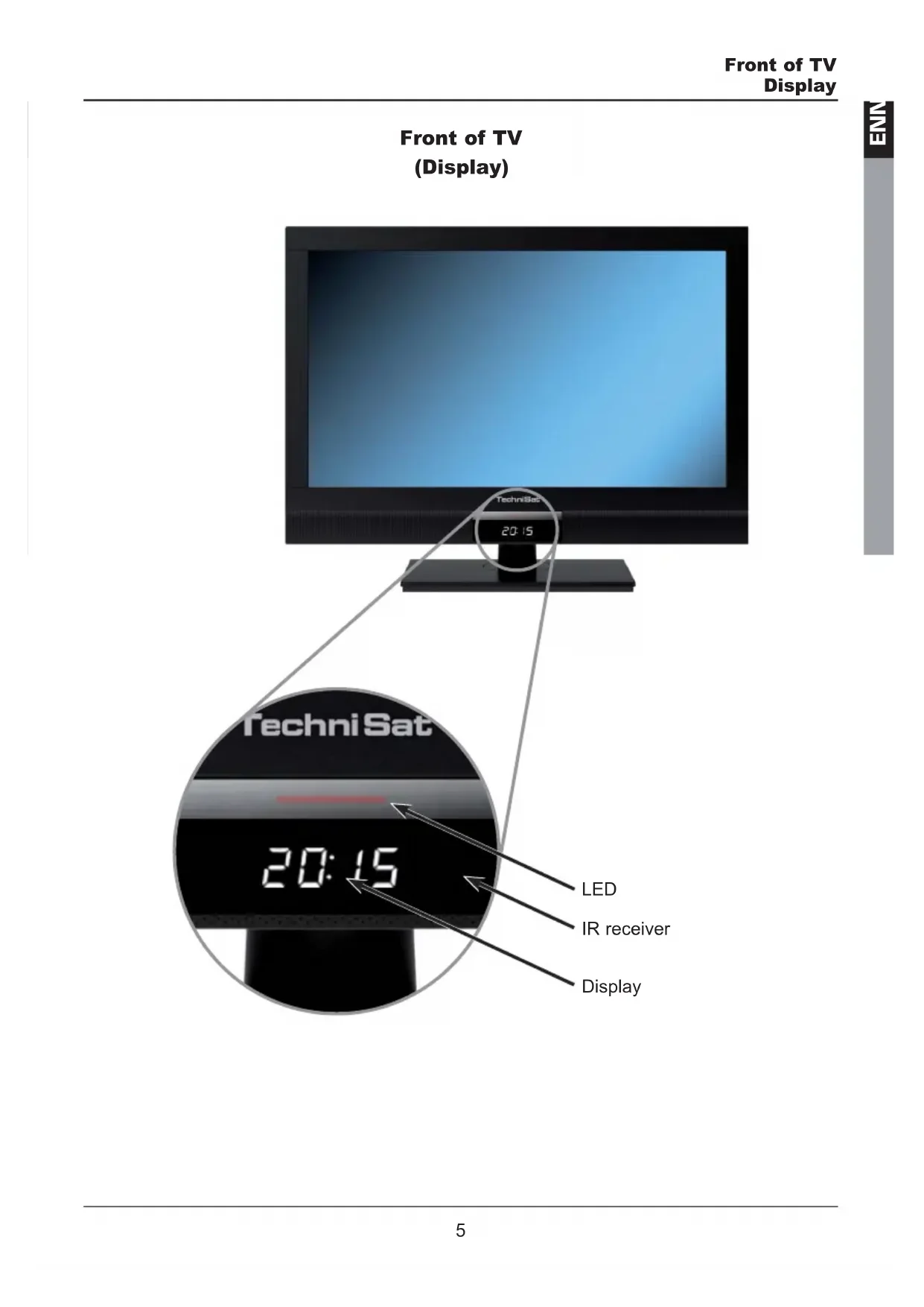 Sleep timer Language selection PaT Genre Teletext Freeze frame / Jogshuttle Timer5 Front of TV Display Front of TV (Display) Display IR receiver LED