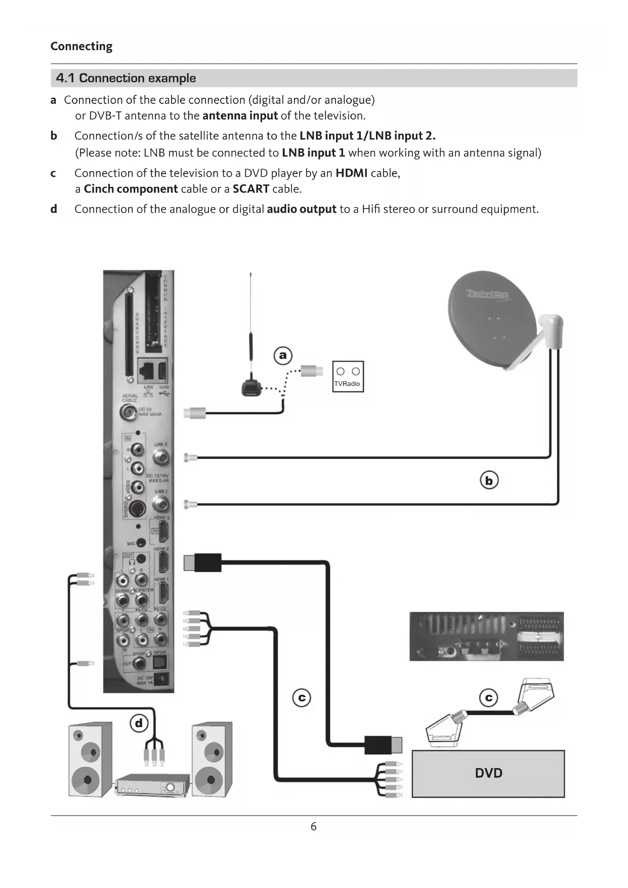 a Connection of the cable connection (digital and/or analogue) or DVB-T antenna to the antenna input of the television. b Connection/s of the satellite antenna to the LNB input 1/LNB input 2. (Please note: LNB must be connected to LNB input 1 when working with an antenna signal) c Connection of the television to a DVD player by an HDMI cable, a Cinch component cable or a SCART cable. d Connection of the analogue or digital audio output to a Hi stereo or surround equipment. DVD TV Radio