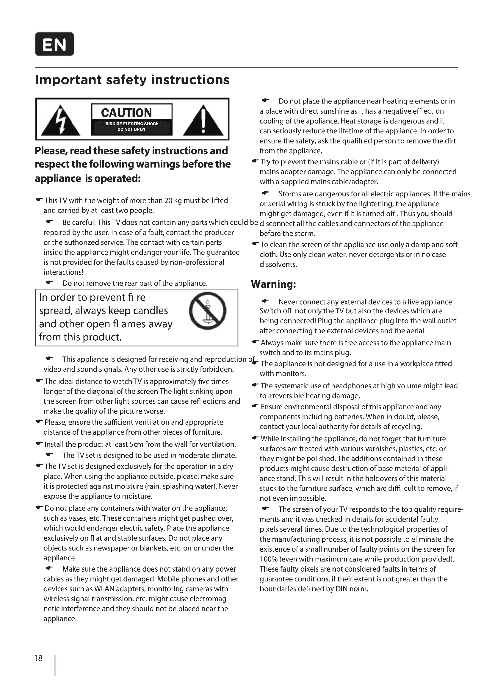 Never connect any external devices to a live appliance. Switch o not only the TV but also the devices which are being connected! Plug the appliance plug into the wall outlet after connecting the external devices and the aerial! Always make sure there is free access to the appliance main switch and to its mains plug. The appliance is not designed for a use in a workplace tted with monitors. The systematic use of headphones at high volume might lead to irreversible hearing damage. Ensure environmental disposal of this appliance and any components including batteries. When in doubt, please, contact your local authority for details of recycling. While installing the appliance, do not forget that furniture surfaces are treated with various varnishes, plastics, etc. or they might be polished. The additions contained in these products might cause destruction of base material of appli-ance stand. This will result in the holdovers of this material stuck to the furniture surface, which are di cult to remove, if not even impossible. The screen of your TV responds to the top quality require- ments and it was checked in details for accidental faulty pixels several times. Due to the technological properties of the manufacturing process, it is not possible to eliminate the existence of a small number of faulty points on the screen for 100% (even with maximum care while production provided). These faulty pixels are not considered faults in terms of guarantee conditions, if their extent is not greater than the boundaries de ned by DIN norm.19 Important safety instructions Important information regarding use of video games, computers, captions and other xed image displays. The extended use of xed image program material can cause a permanent “shadow image “ on LCD screen (this is sometimes incorrectly referred to as “burnout to the screen“). This shadow image is then permanently visible on the screen in the backro-und. It is a partly irreversible damage. You can avoid such a damage by respecting the following instructions: Reduce the brightness/contrast setting to a minimum viewing level. Do not display the xed image for a long period of time. Avoid displaying of: » Teletext time and charts, » TV/DVD menu, e.g. DVD contents, » In the „Pause“ mode (hold): Do not use this mode for a long time, e.g. while watching a DVD or a video. » Turn o the appliance if you are not using it. Batteries Observe the correct polarity when inserting the batteries. Do not expose batteries to high tempera- tures and do not place them on locations where the temperature might increase quickly, e.g. near the re or on the direct sunshine. Do not expose batteries to excessive radiant heat, do not throw them into the re, do not disassemble them and do not try to recharge unrechar- geable batteries. They could leak out or explode. » Never use di erent batteries together or mix new and old ones. » Dispose of batteries in an environmentally friendly way. » Most of the EU countries regulate the disposal of batteries by law. Disposal Do not dispose of this appliance as unsor- ted municipal waste. Return it to a desig- nated collection point for the recycling of WEEE. By doing so, you will help to converse resources and protect the environment. Contact your retailer or local authorities for more information. Cd20