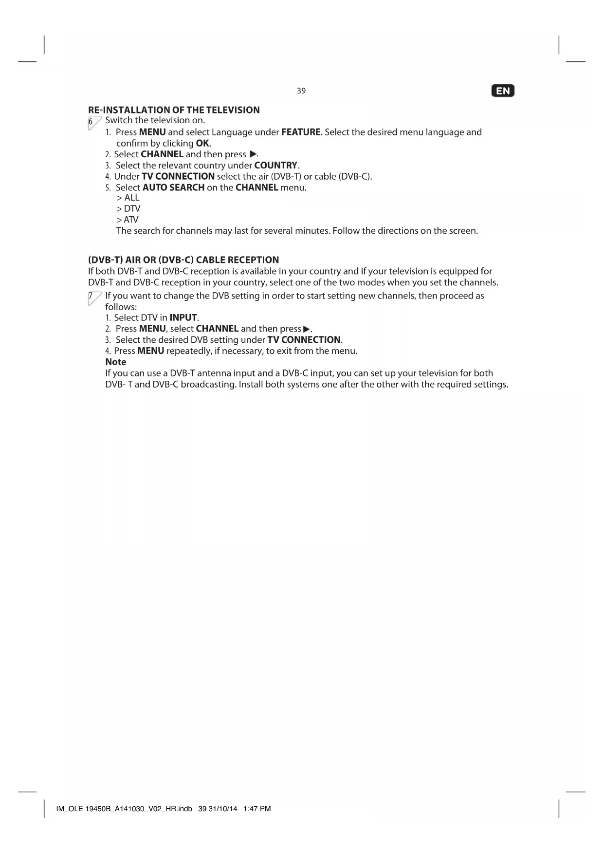 Note If you can use a DVB-T antenna input and a DVB-C input, you can set up your television for both DVB- T and DVB-C broadcasting. Install both systems one after the other with the required settings. IM_OLE 19450B_A141030_V02_HR.indb 39 31/10/14 1:47 PM40