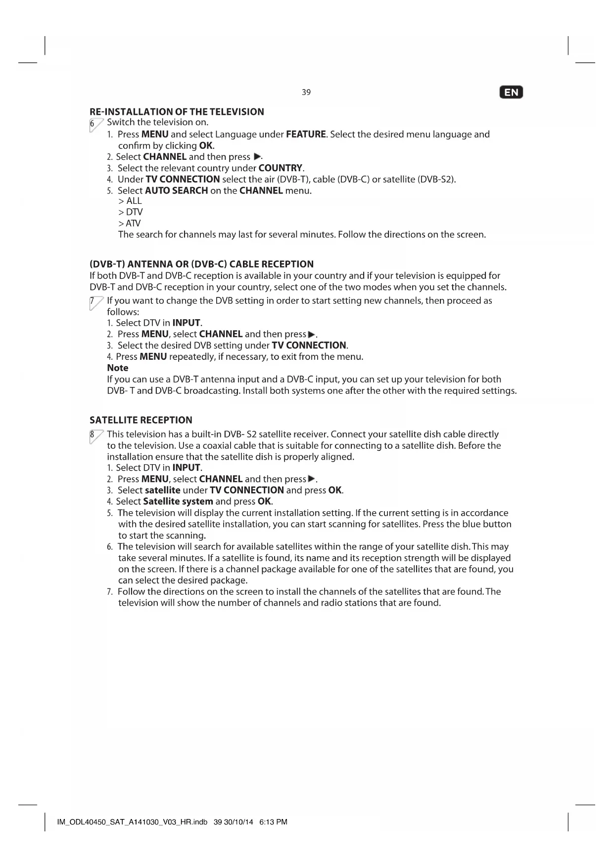 INTENDED USE This product is intended for receiving and playing audio, video and television signals. Only use according to these instructions. Improper use is dangerous and will void warranty claim. Observe the safety instructions. IM_ODL40450_SAT_A141030_V03_HR.indb 34 30/10/14 6:13 PM35