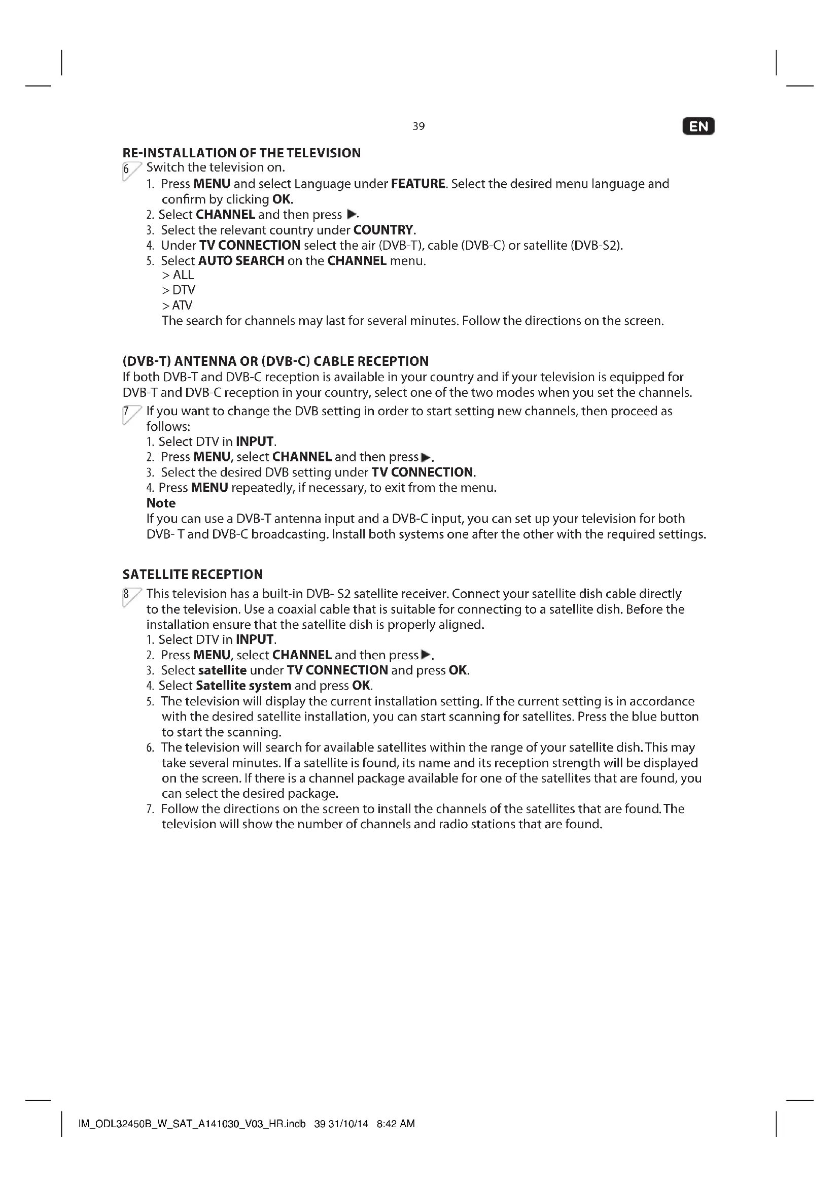 INTENDED USE This product is intended for receiving and playing audio, video and television signals. Only use according to these instructions. Improper use is dangerous and will void warranty claim. Observe the safety instructions. IM_ODL32450B_W_SAT_A141030_V03_HR.indb 34 31/10/14 8:42 AM35