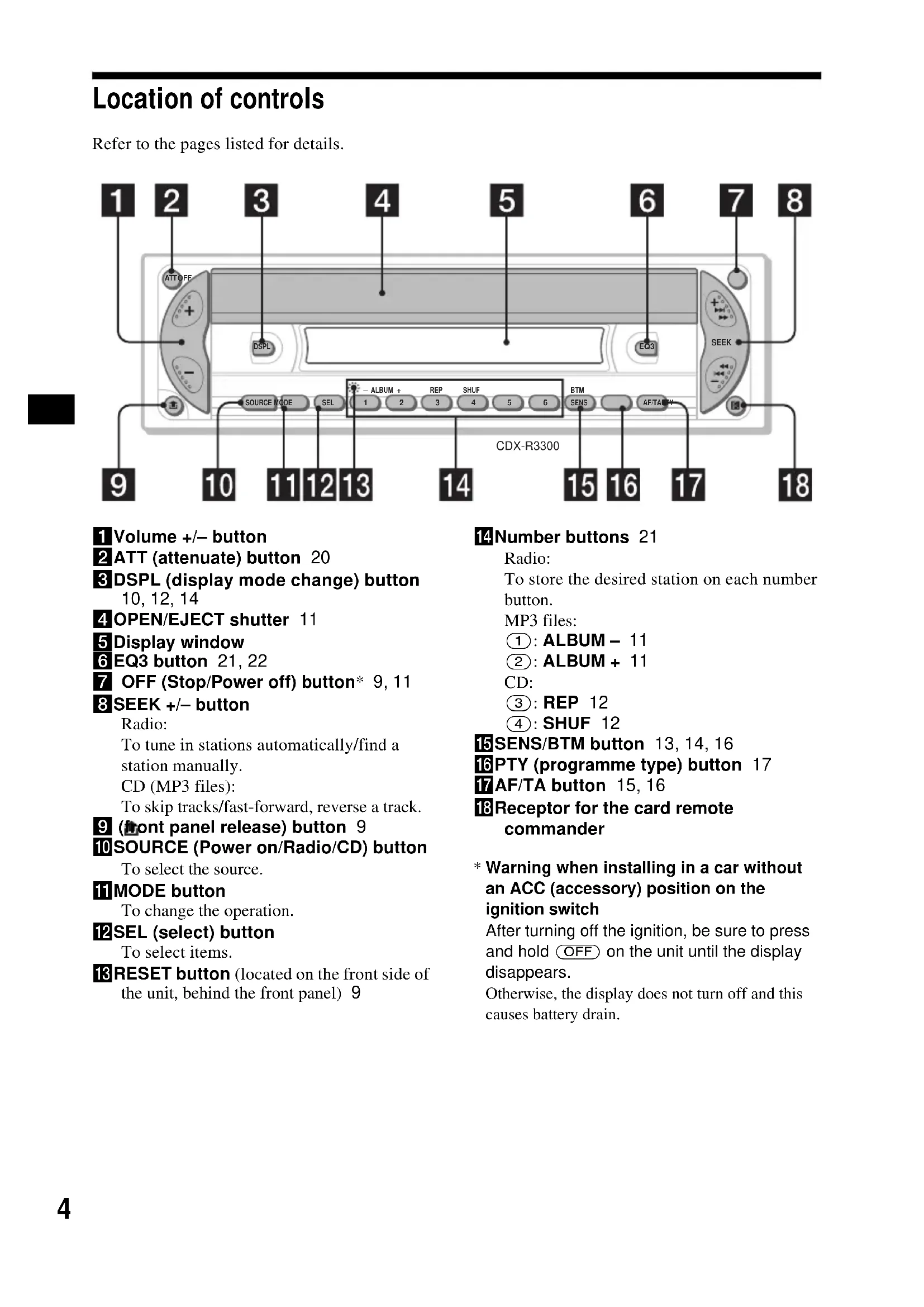 - Optional controller accessories Card remote commander RM-X114 Rotary commander RM-X4S *1 A CD TEXT disc is an audio CD that includes information such as the disc name, artist name, and track names. This information is recorded on the disc. *2 ID3 tag is an MP3 file that contains information about album name, artist name, track name, etc. This label is located on the bottom of the chassis.3 Table of Contents Location of controls . . . . . . . . . . . . . . . . . . . 4 Precautions . . . . . . . . . . . . . . . . . . . . . . . . . . 6 Notes on discs . . . . . . . . . . . . . . . . . . . . . . . . 6 About MP3 files . . . . . . . . . . . . . . . . . . . . . . 7 Getting Started Resetting the unit. . . . . . . . . . . . . . . . . . . . . . 9 Detaching the front panel . . . . . . . . . . . . . . . 9 Setting the clock . . . . . . . . . . . . . . . . . . . . . 10 CD Player Playing a disc. . . . . . . . . . . . . . . . . . . . . . . . 11 Display items. . . . . . . . . . . . . . . . . . . . . . . . 12 Playing tracks repeatedly — Repeat Play . . . . . . . . . . . . . . . . . . . . 12 Playing tracks in random order — Shuffle Play . . . . . . . . . . . . . . . . . . . . 12 Radio Storing stations automatically — Best Tuning Memory (BTM). . . . . . . 13 Receiving the stored stations. . . . . . . . . . . . 13 Storing only the desired stations . . . . . . . . . 14 RDS Overview of RDS . . . . . . . . . . . . . . . . . . . . 14 Automatic retuning for best reception results — AF (Alternative Frequencies) . . . . . . 15 Receiving traffic announcements — TA (Traffic Announcement)/ TP (Traffic Programme) . . . . . . . . . . . . . 16 Presetting RDS stations with the AF and TA setting . . . . . . . . . . . . . . . . . . . . . . . . . . . 16 Tuning in stations by programme type — PTY (Programme types) . . . . . . . . . . 17 Setting the clock automatically — CT (Clock Time) . . . . . . . . . . . . . . . . 18 Other Functions Using the rotary commander. . . . . . . . . . . . 18 Adjusting the sound characteristics . . . . . . 20 Quickly attenuating the sound . . . . . . . . . . 20 Changing the sound and display settings — Menu . . . . . . . . . . . . . . . . . . . . . . . . . 20 Setting the equalizer (EQ3). . . . . . . . . . . . . 21 Additional Information Maintenance . . . . . . . . . . . . . . . . . . . . . . . . 22 Removing the unit. . . . . . . . . . . . . . . . . . . . 23 Specifications . . . . . . . . . . . . . . . . . . . . . . . 25 Troubleshooting . . . . . . . . . . . . . . . . . . . . . 26 Error displays/Messages . . . . . . . . . . . . . . . 274 Location of controls Refer to the pages listed for details. a Volume +/– button b ATT (attenuate) button 20 c DSPL (display mode change) button 10, 12, 14 d OPEN/EJECT shutter 11 e Display window f EQ3 button 21, 22 g OFF (Stop/Power off) button* 9, 11 h SEEK +/– button Radio: To tune in stations automatically/find a station manually. CD (MP3 files): To skip tracks/fast-forward, reverse a track. i (front panel release) button 9 j SOURCE (Power on/Radio/CD) button To select the source. k MODE button To change the operation. l SEL (select) button To select items. m RESET button (located on the front side of the unit, behind the front panel) 9 n Number buttons 21 Radio: To store the desired station on each number button. MP3 files: (1): ALBUM – 11 (2): ALBUM + 11 CD: (3): REP 12 (4): SHUF 12 o SENS/BTM button 13, 14, 16 p PTY (programme type) button 17 q AF/TA button 15, 16 r Receptor for the card remote commander