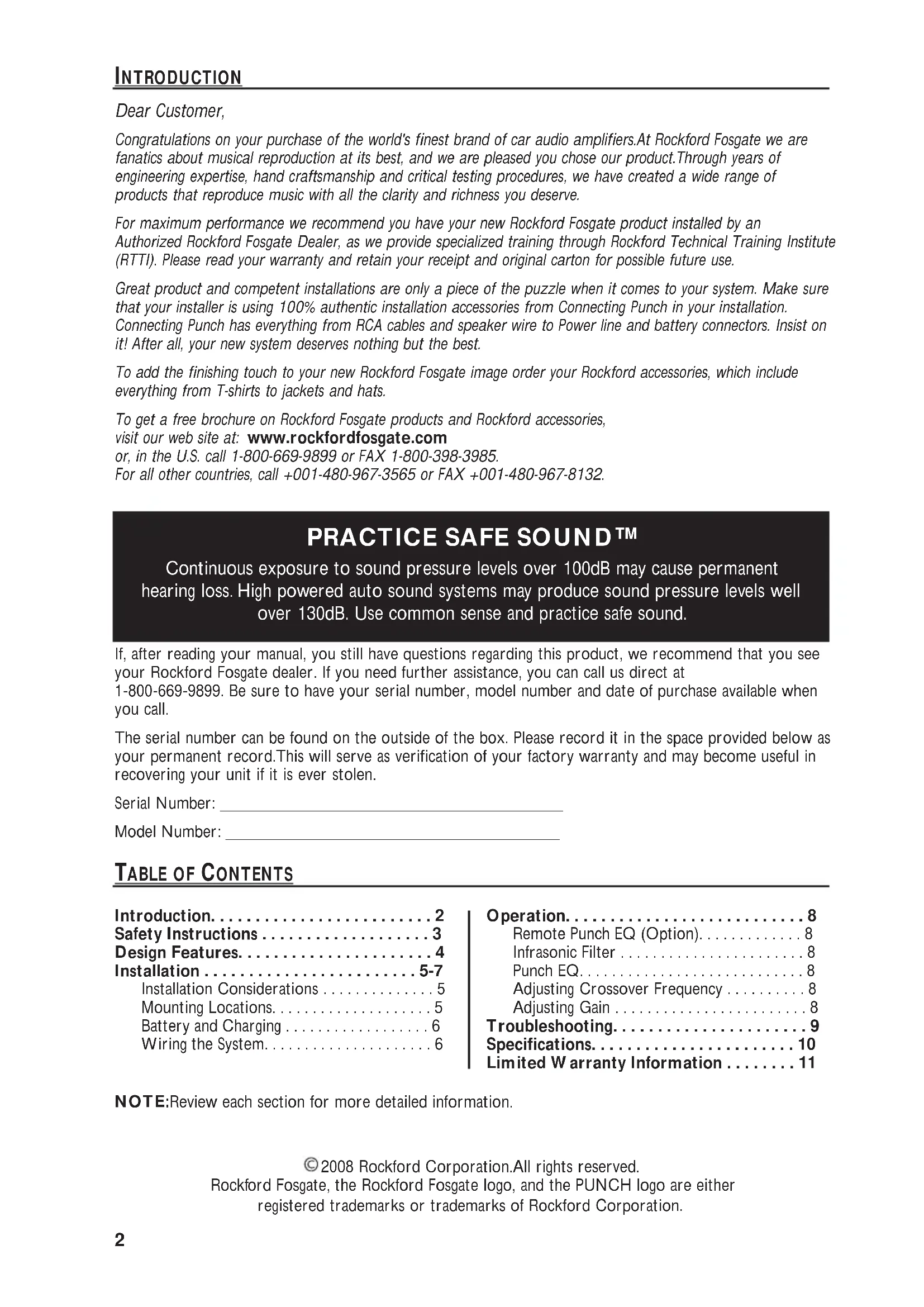 If, after reading your manual, you still have questions regarding this product, we recommend that you see your Rockford Fosgate dealer. If you need further assistance, you can call us direct at 1-800-669-9899. Be sure to have your serial number, model number and date of purchase available when you call.