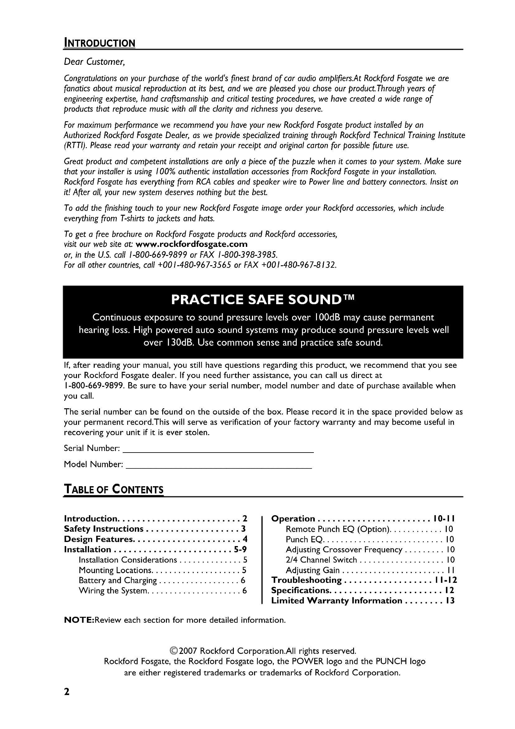 Dear Customer, Congratulations on your purchase of the world's finest brand of car audio amplifiers.At Rockford Fosgate we are fanatics about musical reproduction at its best, and we are pleased you chose our product.Through years of engineering expertise, hand craftsmanship and critical testing procedures, we have created a wide range of products that reproduce music with all the clarity and richness you deserve. For maximum performance we recommend you have your new Rockford Fosgate product installed by an Authorized Rockford Fosgate Dealer, as we provide specialized training through Rockford Technical Training Institute (RTTI). Please read your warranty and retain your receipt and original carton for possible future use. Great product and competent installations are only a piece of the puzzle when it comes to your system. Make sure that your installer is using 100% authentic installation accessories from Rockford Fosgate in your installation. Rockford Fosgate has everything from RCA cables and speaker wire to Power line and battery connectors. Insist on it! After all, your new system deserves nothing but the best. To add the finishing touch to your new Rockford Fosgate image order your Rockford accessories, which include everything from T-shirts to jackets and hats. To get a free brochure on Rockford Fosgate products and Rockford accessories, visit our web site at: www.rockfordfosgate.com or, in the U.S. call 1-800-669-9899 or FAX 1-800-398-3985. For all other countries, call +001-480-967-3565 or FAX +001-480-967-8132.