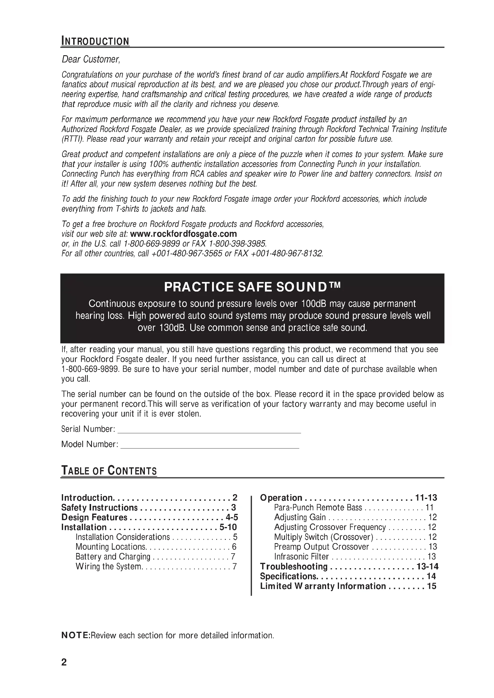 If, after reading your manual, you still have questions regarding this product, we recommend that you see your Rockford Fosgate dealer. If you need further assistance, you can call us direct at 1-800-669-9899. Be sure to have your serial number, model number and date of purchase available when you call.