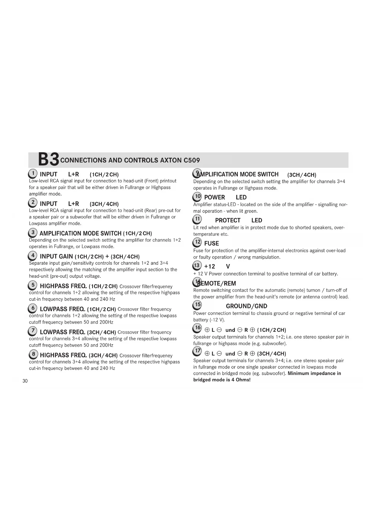 Speaker output terminals for one stereo speaker pair or one single speaker connected in bridged mode (e.g. subwoofer) In bridged mode the minimum speaker impedance is 4 Ohms!