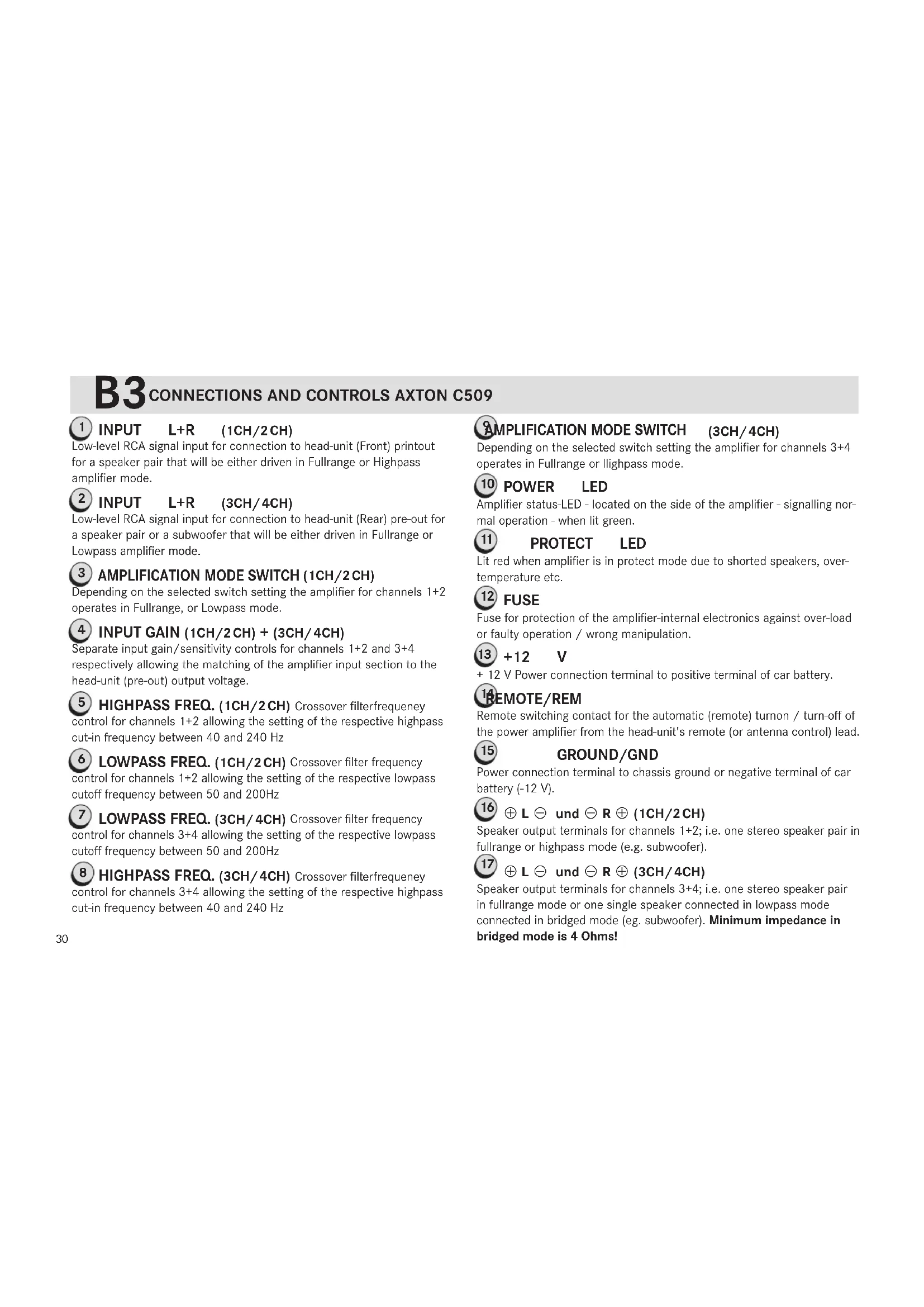 Connections & Controls REAR-PANEL AXTON C509 16 CS09 FUSE +12V RMT GND + 1CH - - 2CH + POWER + 3CH - - 4CH + SPEAKER 12 13 1514 17B3 CONNECTIONS AND CONTROLS AXTON C509