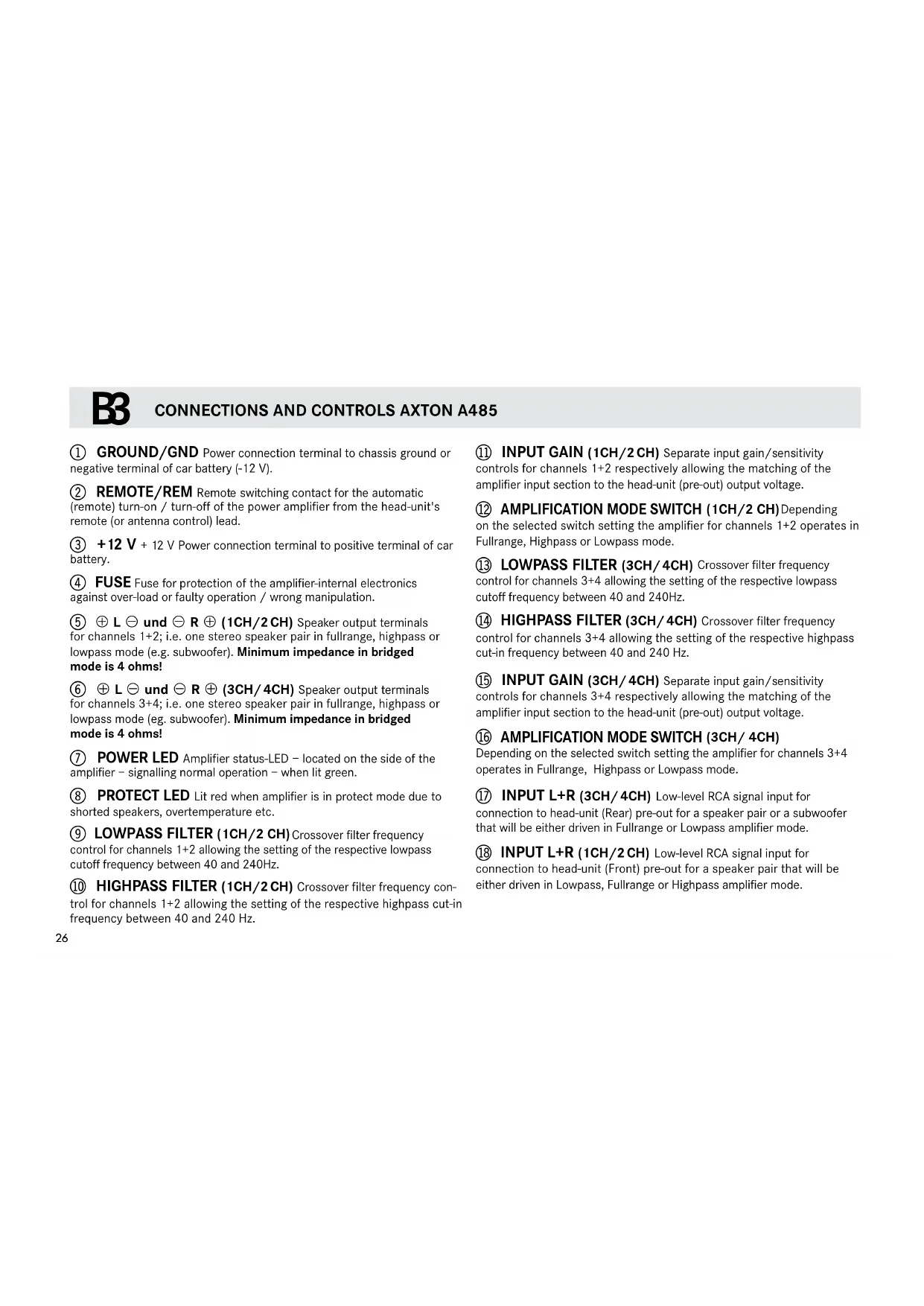 The AXTON amplifier series has been developed for the use with mobile sound systems using 12 Volts negative chassis ground power supply. The amplifiers may be used in combination with almost any brand and type of head unit and speakers in cars, vans, boats etc. and when installed correctly, AXTON amps will produce exceptional results. In order to familiarize yourself with all the special features and controlling options of your brandnew power amplifier, we advise you to read these instructions carefully before attempting the actual installation.
