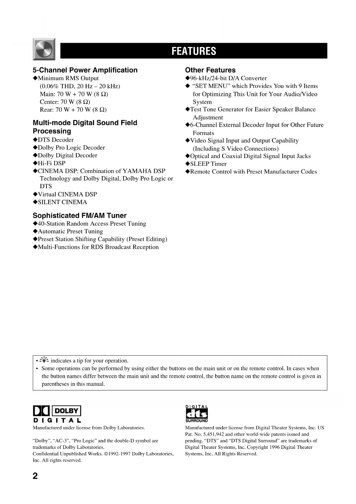 - Some operations can be performed by using either the buttons on the main unit or on the remote control. In cases when the button names differ between the main unit and the remote control, the button name on the remote control is given inparentheses in this manual. 5-Channel Power Amplification ◆ Minimum RMS Output (0.06% THD, 20 Hz – 20 kHz) Main: 70 W + 70 W (8 Ω) Center: 70 W (8 Ω) Rear: 70 W + 70 W (8 Ω) Multi-mode Digital Sound Field Processing ◆ DTS Decoder ◆ Dolby Pro Logic Decoder ◆ Dolby Digital Decoder ◆ Hi-Fi DSP ◆ CINEMA DSP: Combination of YAMAHA DSP Technology and Dolby Digital, Dolby Pro Logic or DTS ◆ Virtual CINEMA DSP ◆ SILENT CINEMA Sophisticated FM/AM Tuner ◆ 40-Station Random Access Preset Tuning ◆ Automatic Preset Tuning ◆ Preset Station Shifting Capability (Preset Editing) ◆ Multi-Functions for RDS Broadcast Reception Other Features ◆ 96-kHz/24-bit D/A Converter ◆ “SET MENU” which Provides You with 9 Items for Optimizing This Unit for Your Audio/Video System ◆ Test Tone Generator for Easier Speaker Balance Adjustment ◆ 6-Channel External Decoder Input for Other Future Formats ◆ Video Signal Input and Output Capability (Including S Video Connections) ◆ Optical and Coaxial Digital Signal Input Jacks ◆ SLEEP Timer ◆ Remote Control with Preset Manufacturer Codes FEATURES
