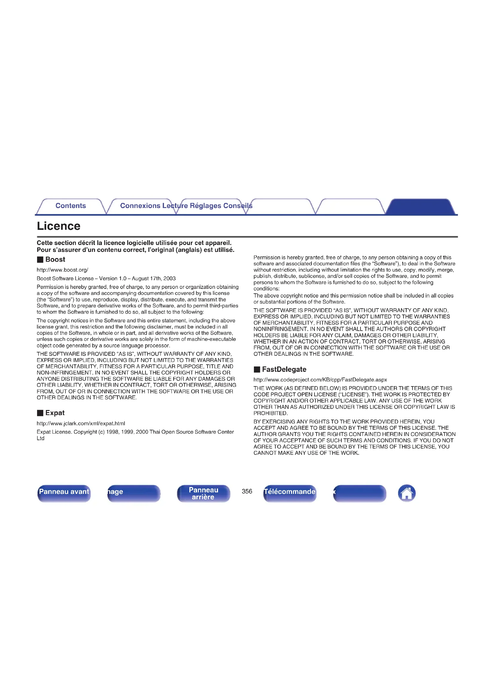 Panneau avant Affichage Panneau arrière Télécommande IndexDefinitions. “Articles” means, collectively, all articles written by Author which describes how the Source Code and Executable Files for the Work may be used by a user. “Author” means the individual or entity that offers the Work under the terms of this License. “Derivative Work” means a work based upon the Work or upon the Work and other pre-existing works. “Executable Files” refer to the executables, binary files, configuration and any required data files included in the Work. “Publisher” means the provider of the website, magazine, CD-ROM, DVD or other medium from or by which the Work is obtained by You. “Source Code” refers to the collection of source code and configuration files used to create the Executable Files. “Standard Version” refers to such a Work if it has not been modified, or has been modified in accordance with the consent of the Author, such consent being in the full discretion of the Author. “Work” refers to the collection of files distributed by the Publisher, including the Source Code, Executable Files, binaries, data files, documentation, whitepapers and the Articles. “You” is you, an individual or entity wishing to use the Work and exercise your rights under this License. Fair Use/Fair Use Rights. Nothing in this License is intended to reduce, limit, or restrict any rights arising from fair use, fair dealing, first sale or other limitations on the exclusive rights of the copyright owner under copyright law or other applicable laws. License Grant. Subject to the terms and conditions of this License, the Author hereby grants You a worldwide, royalty-free, non-exclusive, perpetual (for the duration of the applicable copyright) license to exercise the rights in the Work as stated below: You may use the standard version of the Source Code or Executable Files in Your own applications. You may apply bug fixes, portability fixes and other modifications obtained from the Public Domain or from the Author. A Work modified in such a way shall still be considered the standard version and will be subject to this License. You may otherwise modify Your copy of this Work (excluding the Articles) in any way to create a Derivative Work, provided that You insert a prominent notice in each changed file stating how, when and where You changed that file. You may distribute the standard version of the Executable Files and Source Code or Derivative Work in aggregate with other (possibly commercial) programs as part of a larger (possibly commercial) software distribution. The Articles discussing the Work published in any form by the author may not be distributed or republished without the Author’s consent. The author retains copyright to any such Articles. You may use the Executable Files and Source Code pursuant to this License but you may not repost or republish or otherwise distribute or make available the Articles, without the prior written consent of the Author. Any subroutines or modules supplied by You and linked into the Source Code or Executable Files this Work shall not be considered part of this Work and will not be subject to the terms of this License. Patent License. Subject to the terms and conditions of this License, each Author hereby grants to You a perpetual, worldwide, non-exclusive, no-charge, royalty-free, irrevocable (except as stated in this section) patent license to make, have made, use, import, and otherwise transfer the Work. Restrictions. The license granted in Section 3 above is expressly made subject to and limited by the following restrictions: You agree not to remove any of the original copyright, patent, trademark, and attribution notices and associated disclaimers that may appear in the Source Code or Executable Files. You agree not to advertise or in any way imply that this Work is a product of Your own. The name of the Author may not be used to endorse or promote products derived from the Work without the prior written consent of the Author. You agree not to sell, lease, or rent any part of the Work. This does not restrict you from including the Work or any part of the Work inside a larger software distribution that itself is being sold. The Work by itself, though, cannot be sold, leased or rented. Contents Connexions Lecture Réglages Conseils Annexe