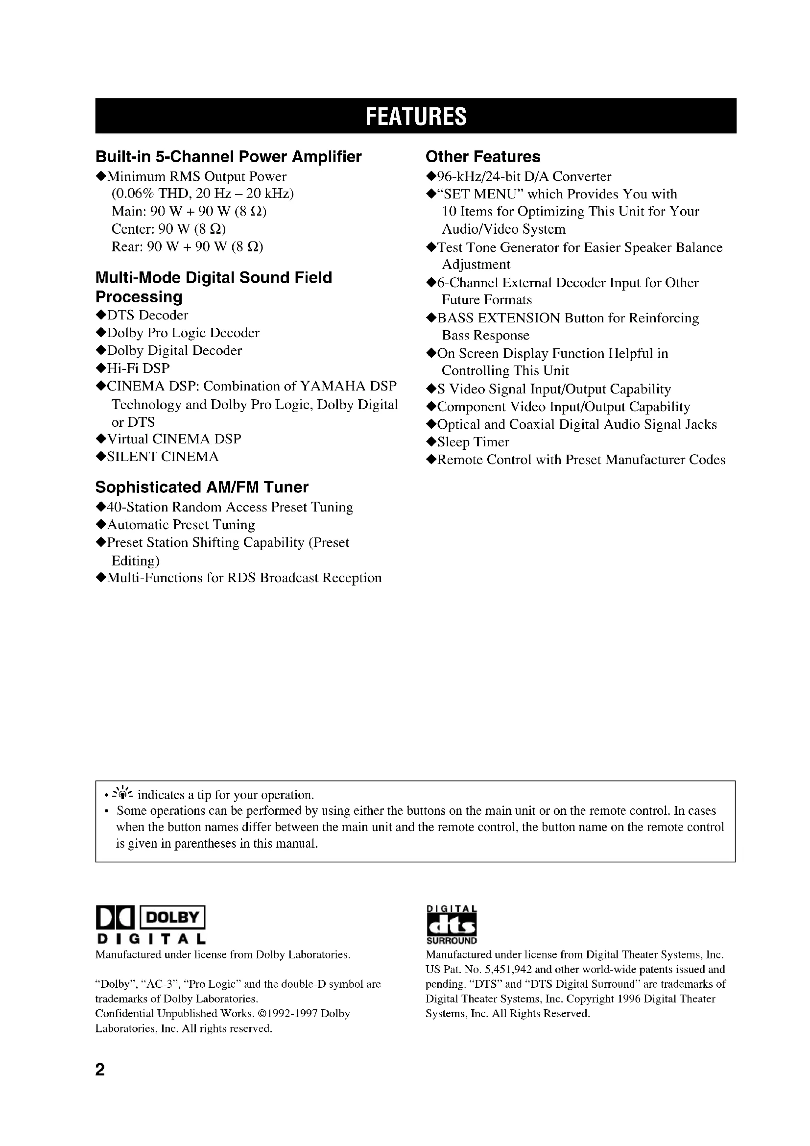 - Some operations can be performed by using either the buttons on the main unit or on the remote control. In cases when the button names differ between the main unit and the remote control, the button name on the remote control is given in parentheses in this manual. Built-in 5-Channel Power Amplifier ◆ Minimum RMS Output Power (0.06% THD, 20 Hz – 20 kHz) Main: 90 W + 90 W (8 Ω) Center: 90 W (8 Ω) Rear: 90 W + 90 W (8 Ω) Multi-Mode Digital Sound Field Processing ◆ DTS Decoder ◆ Dolby Pro Logic Decoder ◆ Dolby Digital Decoder ◆ Hi-Fi DSP ◆ CINEMA DSP: Combination of YAMAHA DSP Technology and Dolby Pro Logic, Dolby Digital or DTS ◆ Virtual CINEMA DSP ◆ SILENT CINEMA Sophisticated AM/FM Tuner ◆ 40-Station Random Access Preset Tuning ◆ Automatic Preset Tuning ◆ Preset Station Shifting Capability (Preset Editing) ◆ Multi-Functions for RDS Broadcast Reception Manufactured under license from Dolby Laboratories. “Dolby”, “AC-3”, “Pro Logic” and the double-D symbol are trademarks of Dolby Laboratories.Confidential Unpublished Works. ©1992-1997 DolbyLaboratories, Inc. All rights reserved.Manufactured under license from Digital Theater Systems, Inc.US Pat. No. 5,451,942 and other world-wide patents issued and pending. “DTS” and “DTS Digital Surround” are trademarks of Digital Theater Systems, Inc. Copyright 1996 Digital TheaterSystems, Inc. All Rights Reserved.