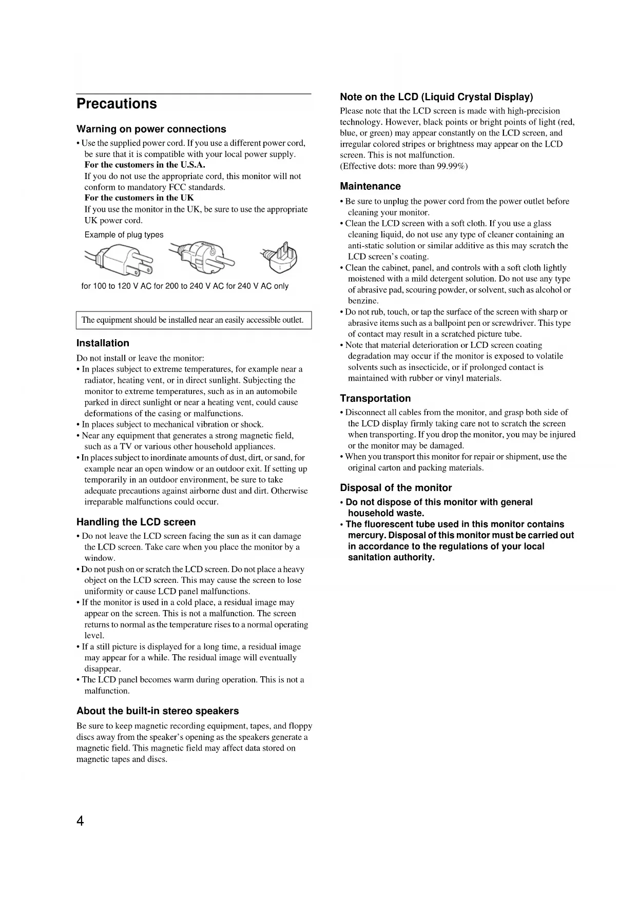 - The fluorescent tube used in this monitor contains mercury. Disposal of this monitor must be carried out in accordance to the regulations of your local sanitation authority. The equipment should be installed near an easily accessible outlet. Example of plug types for 100 to 120 V AC for 200 to 240 V AC for 240 V AC only5