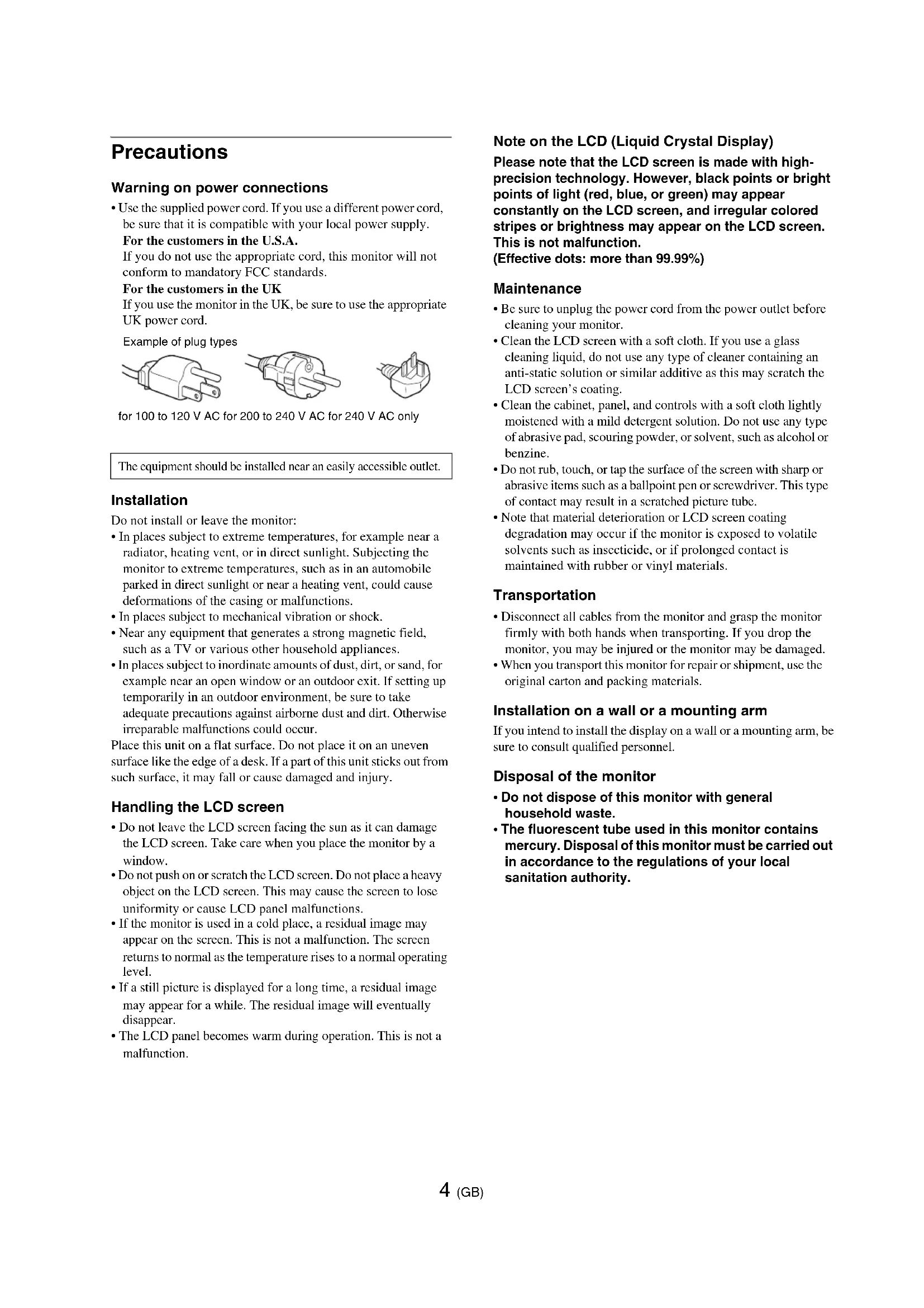 - Furthermore, “™” and “®” are not mentioned in each case in this manual. http://www.sony.net/ 3 (GB) Precautions. . . . . . . . . . . . . . . . . . . . . . . . . . . . . . . . . . . . . . . . . . . . 4 Identifying parts and controls . . . . . . . . . . . . . . . . . . . . . . . . . . . . . . 5 Setup . . . . . . . . . . . . . . . . . . . . . . . . . . . . . . . . . . . . . . . . . .6 Step 1: Use the stand. . . . . . . . . . . . . . . . . . . . . . . . . . . . . . . . . . . . 6 Step 2: Connect the display to your computer . . . . . . . . . . . . . . . . . 6 Step 3: Connect the power cord. . . . . . . . . . . . . . . . . . . . . . . . . . . . 7 Step 4: Secure the cords . . . . . . . . . . . . . . . . . . . . . . . . . . . . . . . . . 7 Step 5: Turn on the monitor and computer . . . . . . . . . . . . . . . . . . . 7 Adjusting the tilt . . . . . . . . . . . . . . . . . . . . . . . . . . . . . . . . . . . . . . . . 8 Selecting the input signal (INPUT button) (SDM-E76D/SDM-E96D only) . . . . . . . . . . . . . . . . . . . . . . . . . . . . . 8 Customizing Your Monitor . . . . . . . . . . . . . . . . . . . . . . . .9 Navigating the menu. . . . . . . . . . . . . . . . . . . . . . . . . . . . . . . . . . . . . 9 Adjusting the backlight (BACKLIGHT) . . . . . . . . . . . . . . . . . . . . . . 10 Adjusting the contrast (CONTRAST) . . . . . . . . . . . . . . . . . . . . . . . 10 Adjusting the black level of an image (BRIGHTNESS). . . . . . . . . . 11 Adjusting the picture’s sharpness and centering (SCREEN) (analog RGB signal only). . . . . . . . . . . . . . . . . . . . . . . . . . . . . . . . 11 Adjusting the color temperature (COLOR) . . . . . . . . . . . . . . . . . . . 13 Changing the gamma setting (GAMMA). . . . . . . . . . . . . . . . . . . . . 13 Adjusting the sharpness (SHARPNESS) . . . . . . . . . . . . . . . . . . . . 13 Changing the menu’s position (MENU POSITION) . . . . . . . . . . . . 13 Changing the input automatically (INPUT SENSING) (SDM-E76D/SDM-E96D only) . . . . . . . . . . . . . . . . . . . . . . . . . . . . 14 Selecting the on-screen menu language (LANGUAGE). . . . . . . . . 14 Additional settings. . . . . . . . . . . . . . . . . . . . . . . . . . . . . . . . . . . . . . 14 Technical Features . . . . . . . . . . . . . . . . . . . . . . . . . . . . .16 Power saving function. . . . . . . . . . . . . . . . . . . . . . . . . . . . . . . . . . . 16 Automatic picture quality adjustment function (analog RGB signal only) . . . . . . . . . . . . . . . . . . . . . . . . . . . . . . . . 16 Troubleshooting. . . . . . . . . . . . . . . . . . . . . . . . . . . . . . . .17 On-screen messages . . . . . . . . . . . . . . . . . . . . . . . . . . . . . . . . . . . 17 Trouble symptoms and remedies . . . . . . . . . . . . . . . . . . . . . . . . . . 18 Specifications. . . . . . . . . . . . . . . . . . . . . . . . . . . . . . . . . .20 TCO’03 Eco-document . . . . . . . . . . . . . . . . . . . . . . . . . . . . . . . . . . .i4 (GB) Precautions Warning on power connections