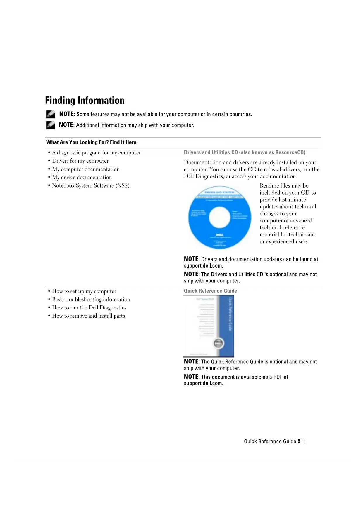 Dell Diagnostics Main Menu . . . . . . . . . . . . . . . . . . . . . . 214 ContentsQuick Reference Guide 5 Finding Information NOTE: Some features may not be available for your computer or in certain countries. NOTE: Additional information may ship with your computer. What Are You Looking For? Find It Here