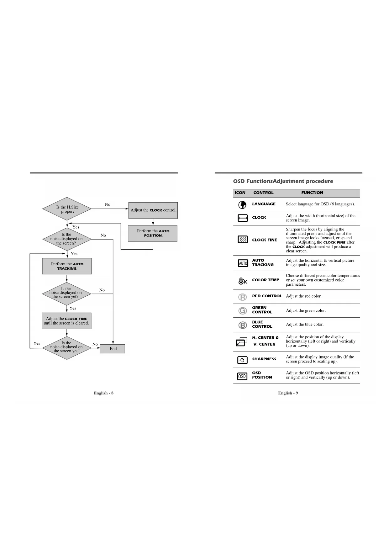 OSD FunctionsAdjustment procedure Adjust the CLOCK control. Perform the AUTO POSITION. Is the H.Size proper? Is the noise displayed on the screen? Perform the AUTO TRACKING. Is the noise displayed on the screen yet? Is the noise displayed on the screen yet? Adjust the CLOCK FINE until the screen is cleared. Yes Yes Yes Yes